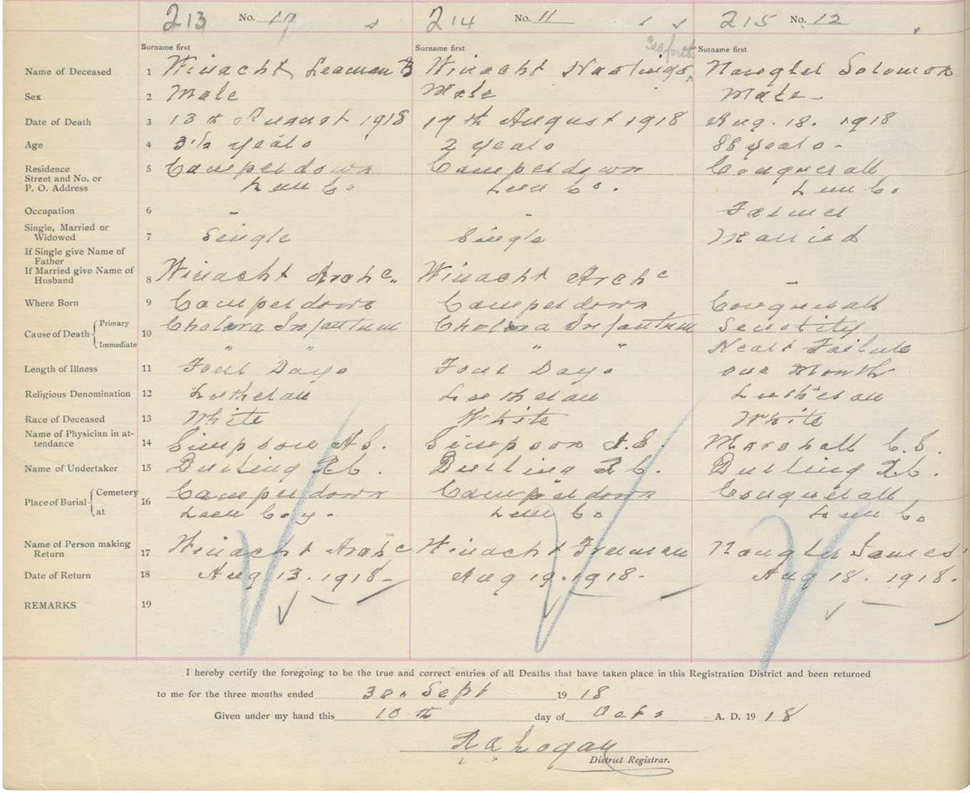Death Registration: Year: 1918 book: 43 page: 66 number: 213