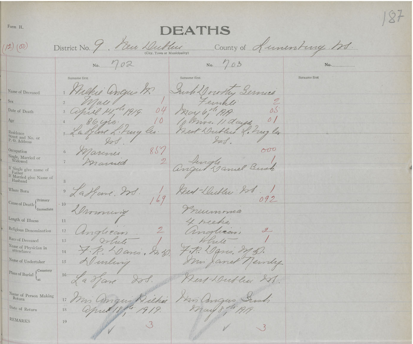 Death Registration: Year: 1919 book: 43 page: 187 number: 703