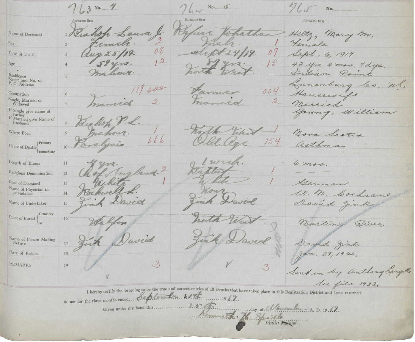 Death Registration: Year: 1919 book: 43 page: 203 number: 765