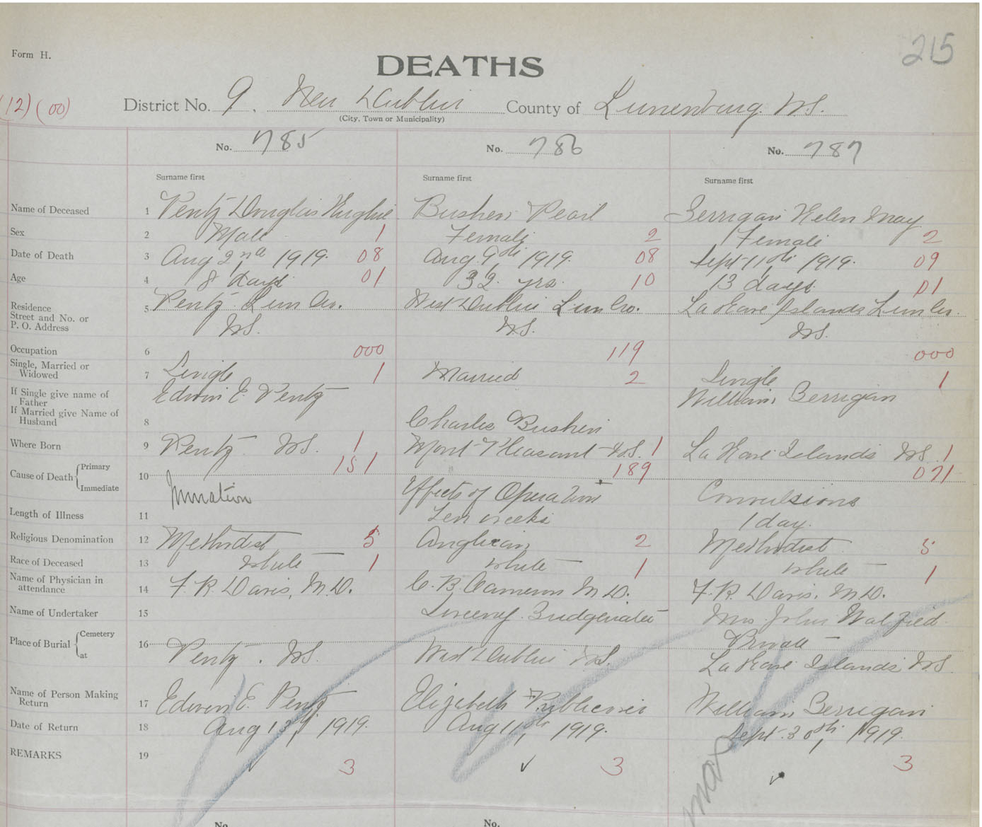 Death Registration: Year: 1919 book: 43 page: 215 number: 787