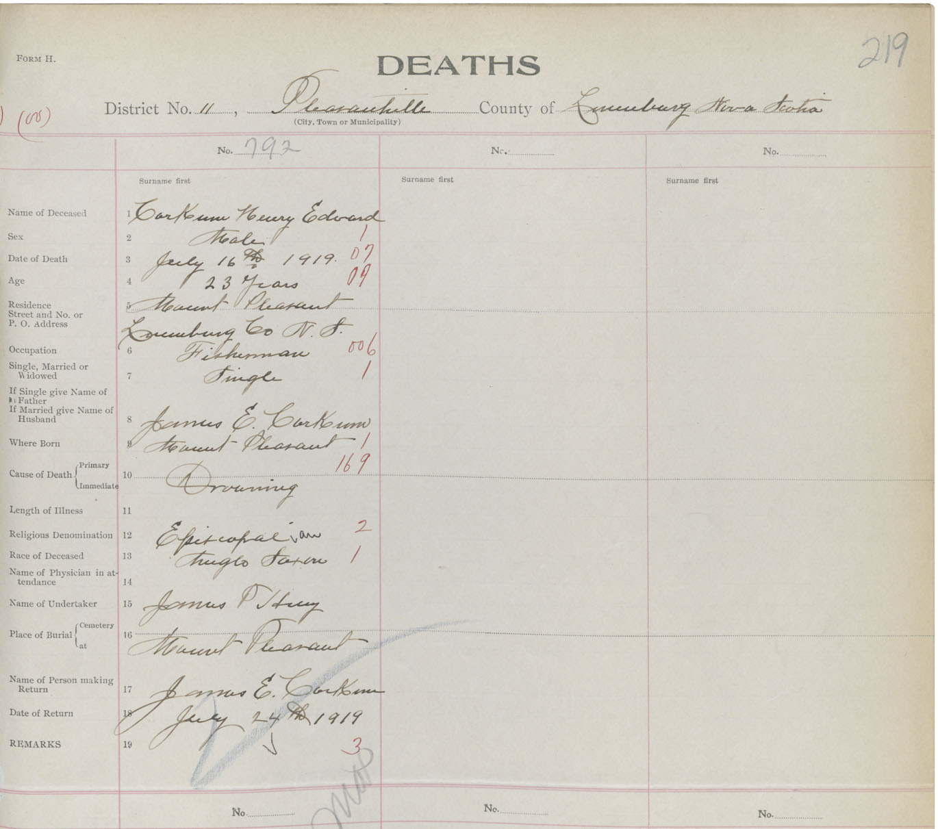 Death Registration: Year: 1919 book: 43 page: 219 number: 792