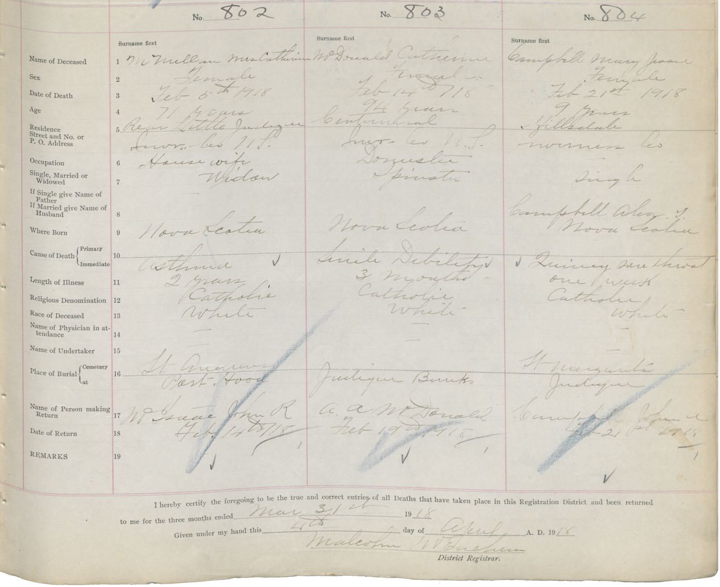 Death Registration: Year: 1918 book: 43 page: 227 number: 803