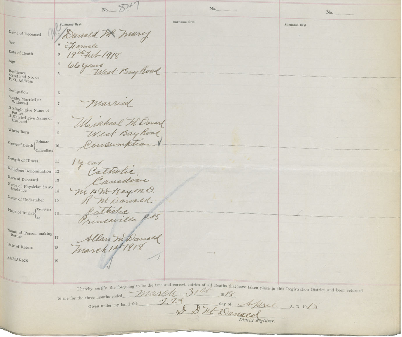 Death Registration: Year: 1918 book: 43 page: 249 number: 847