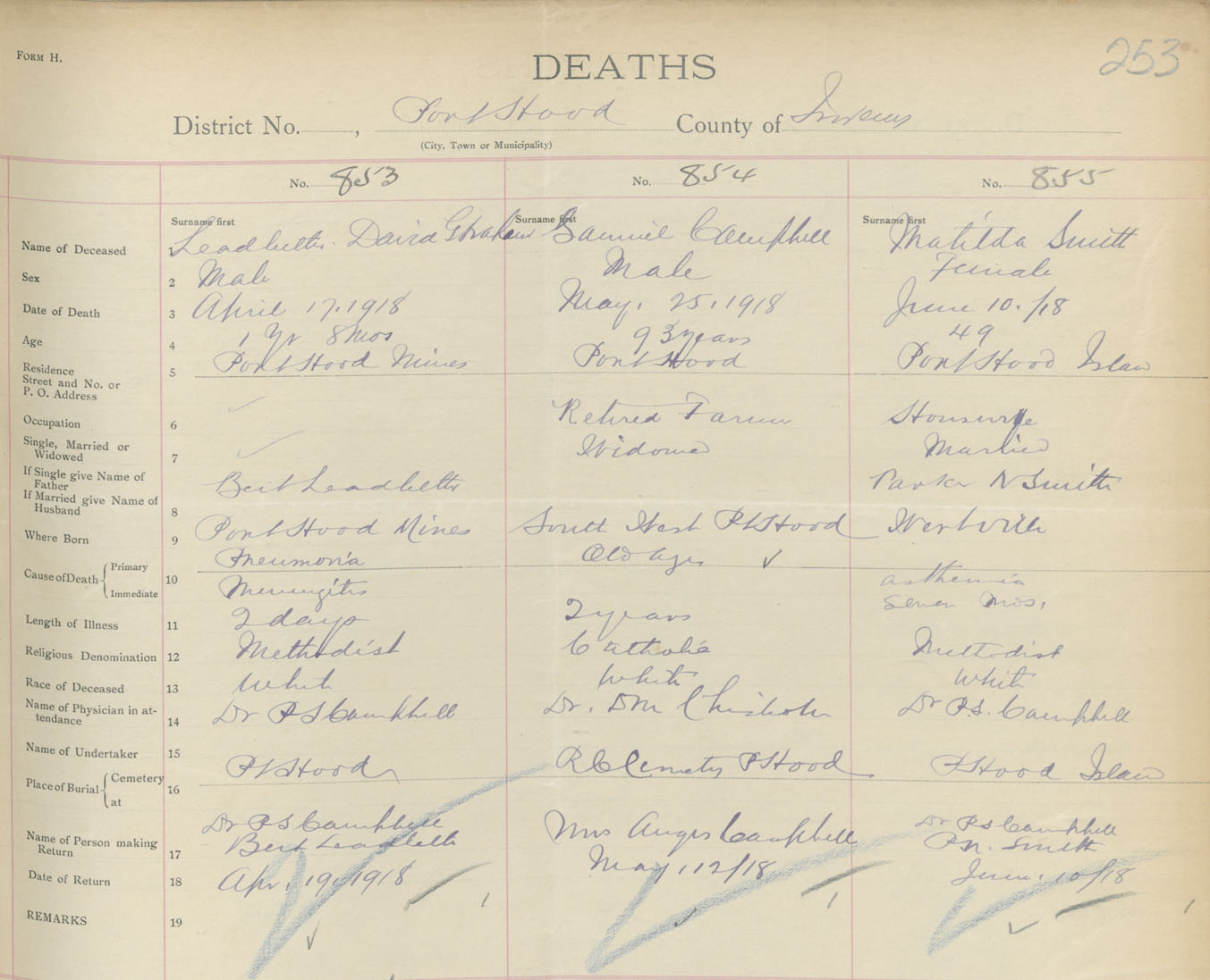 Death Registration: Year: 1918 book: 43 page: 253 number: 853