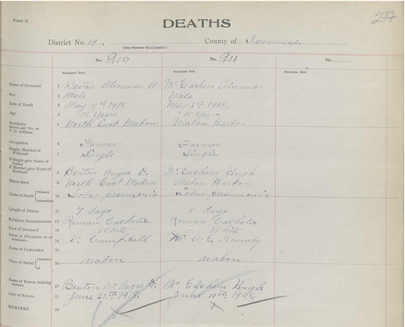 Death Registration: Year: 1918 book: 43 page: 277 number: 910