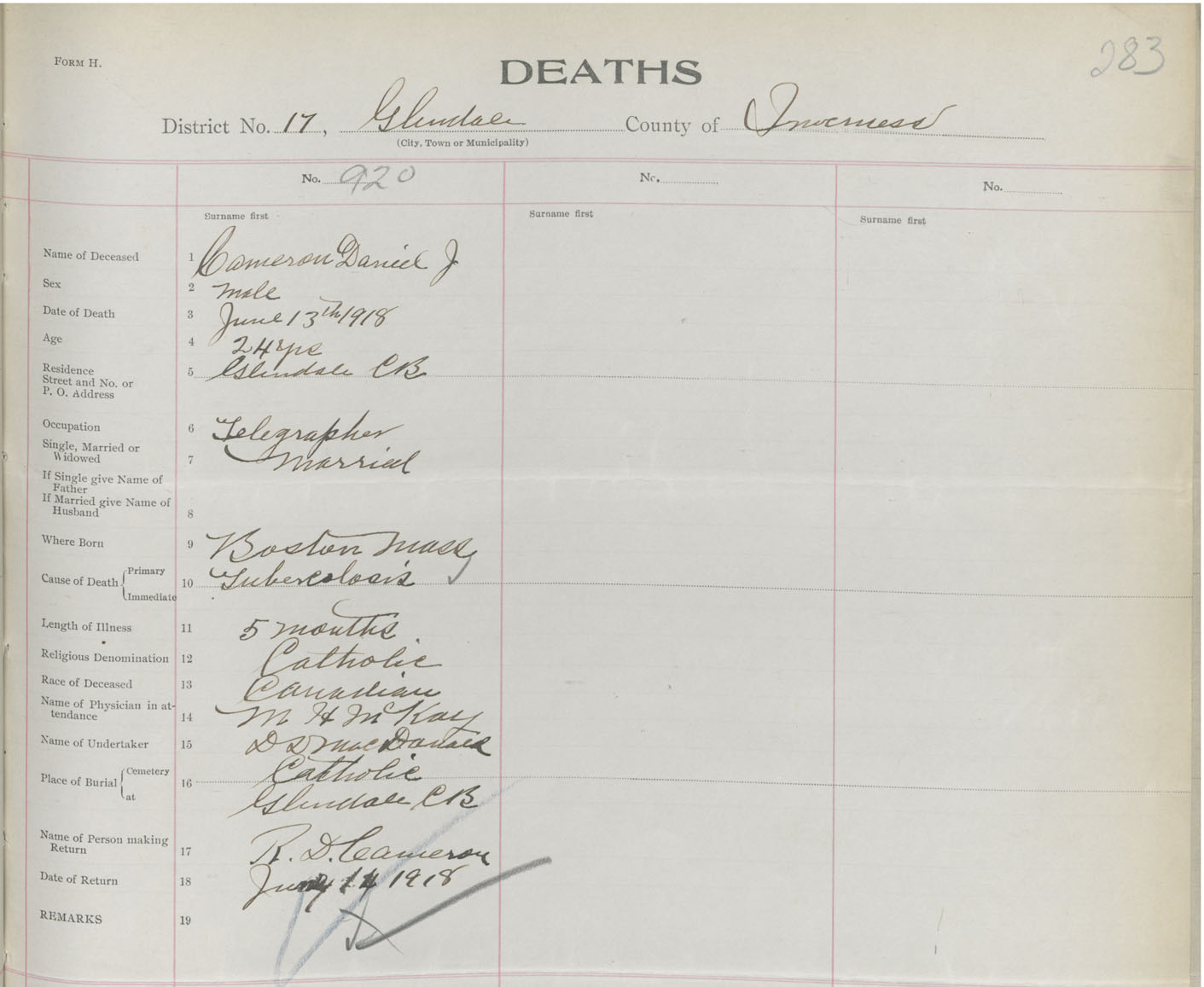 Death Registration: Year: 1918 book: 43 page: 283 number: 920