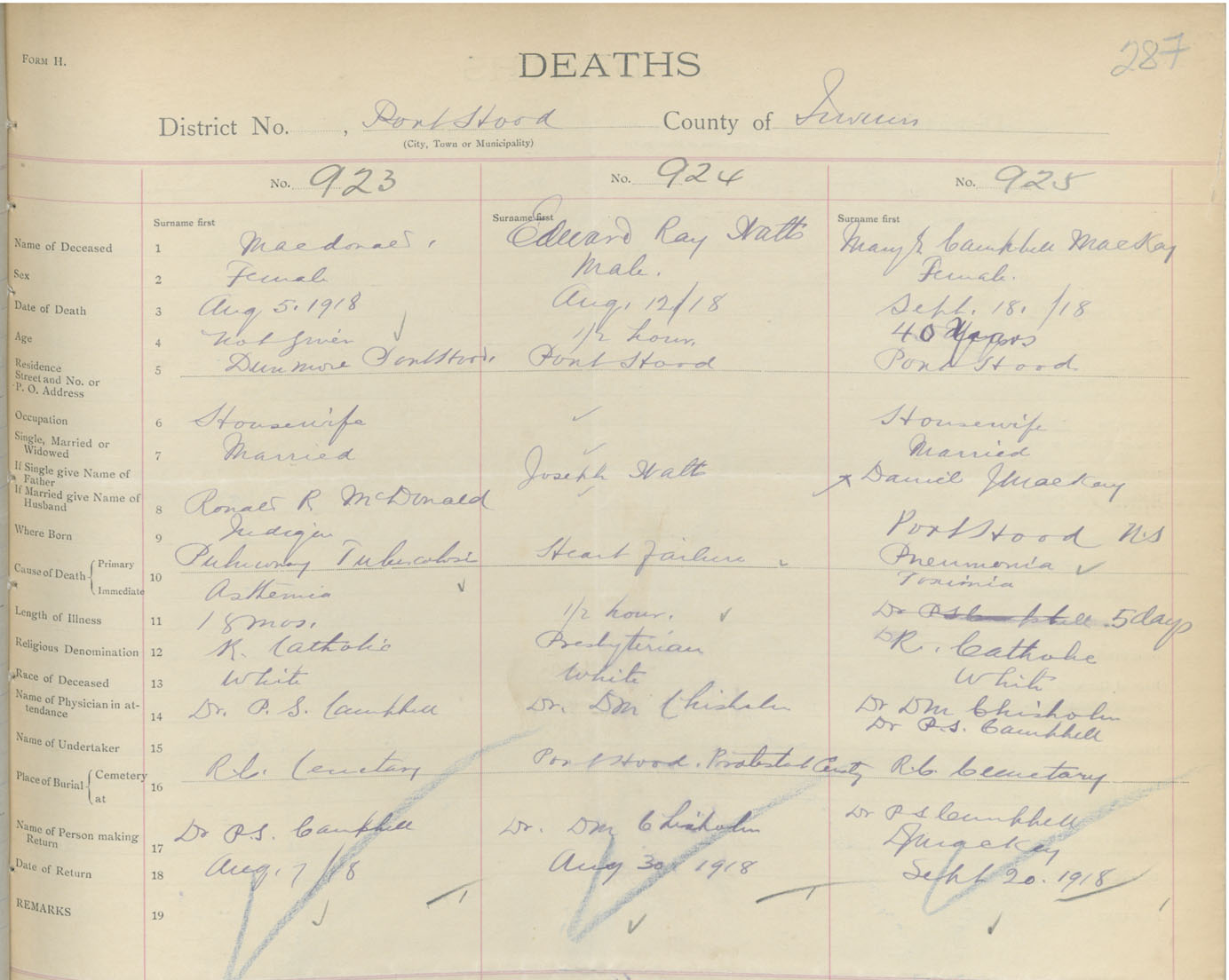 Death Registration: Year: 1918 book: 43 page: 287 number: 925