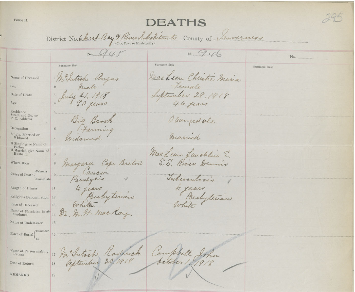 Death Registration: Year: 1918 book: 43 page: 295 number: 946