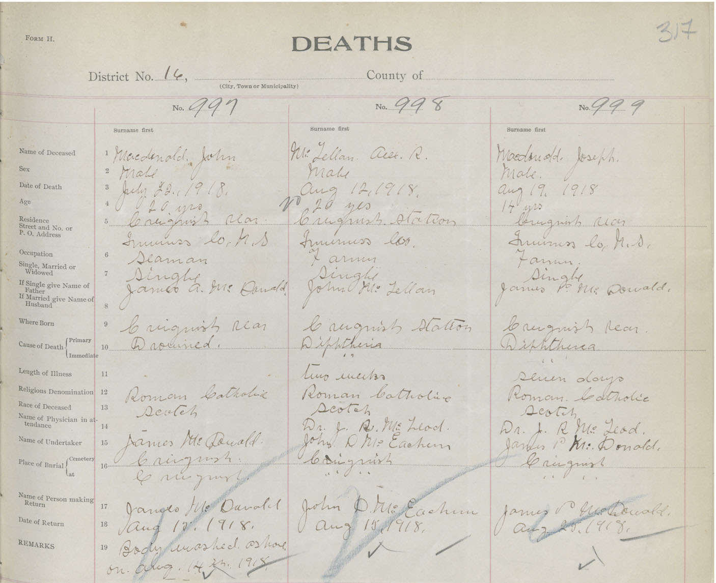 Death Registration: Year: 1918 book: 43 page: 317 number: 999