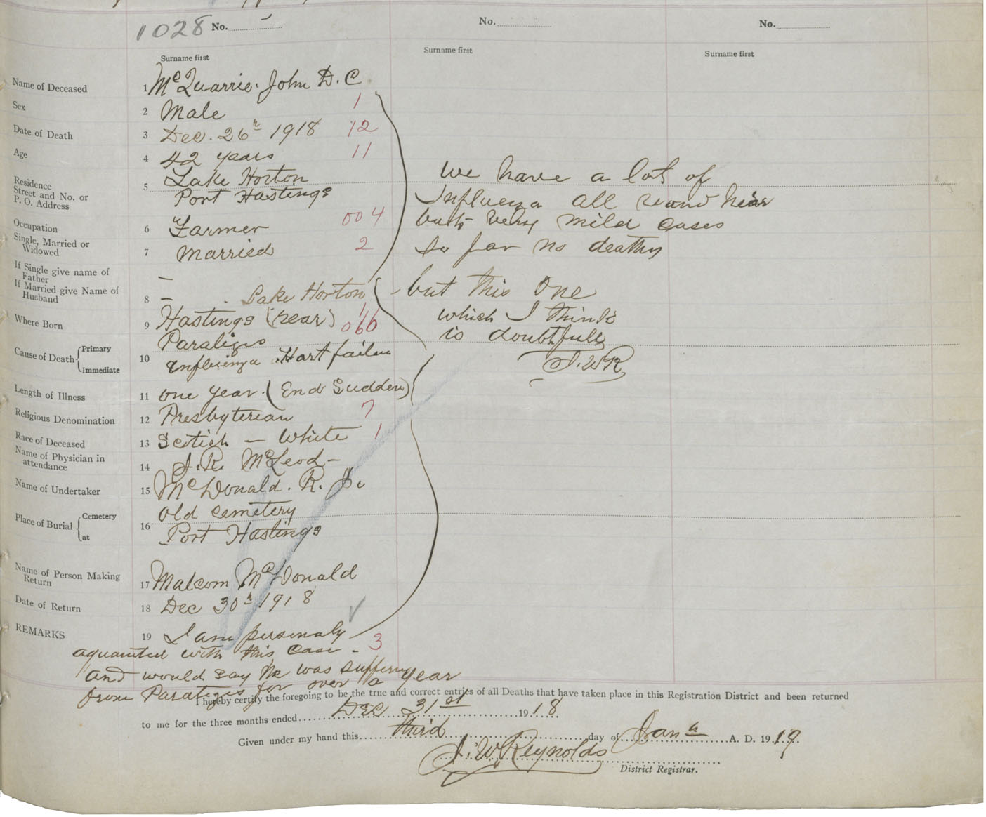Death Registration: Year: 1918 book: 43 page: 335 number: 1028