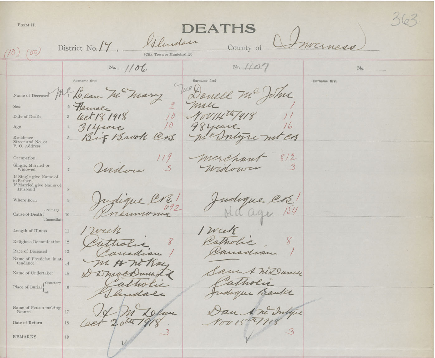 Death Registration: Year: 1918 book: 43 page: 363 number: 1106