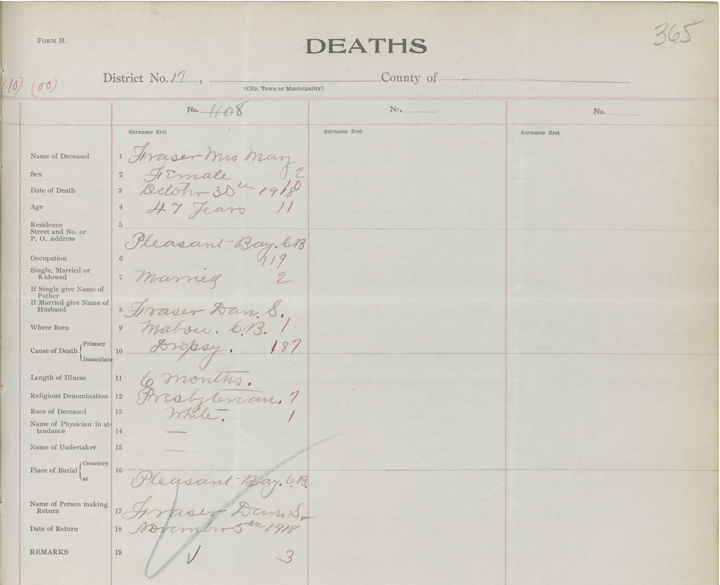 Death Registration: Year: 1918 book: 43 page: 365 number: 1108