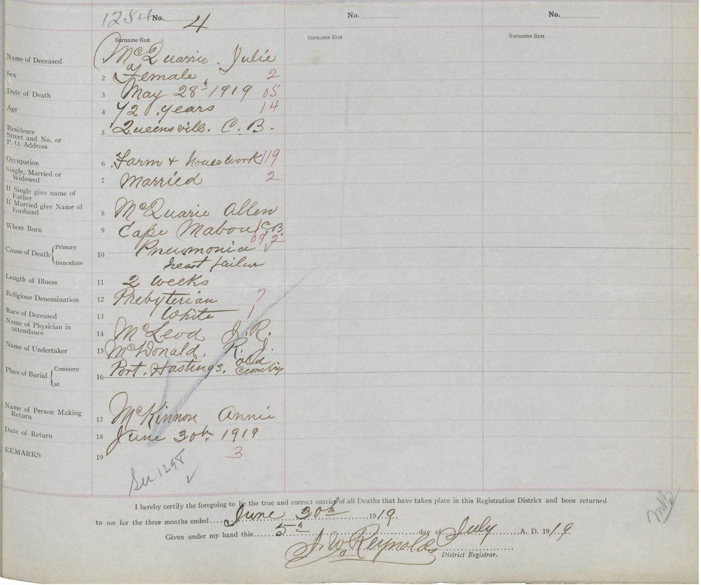 Death Registration: Year: 1919 book: 43 page: 415 number: 1254