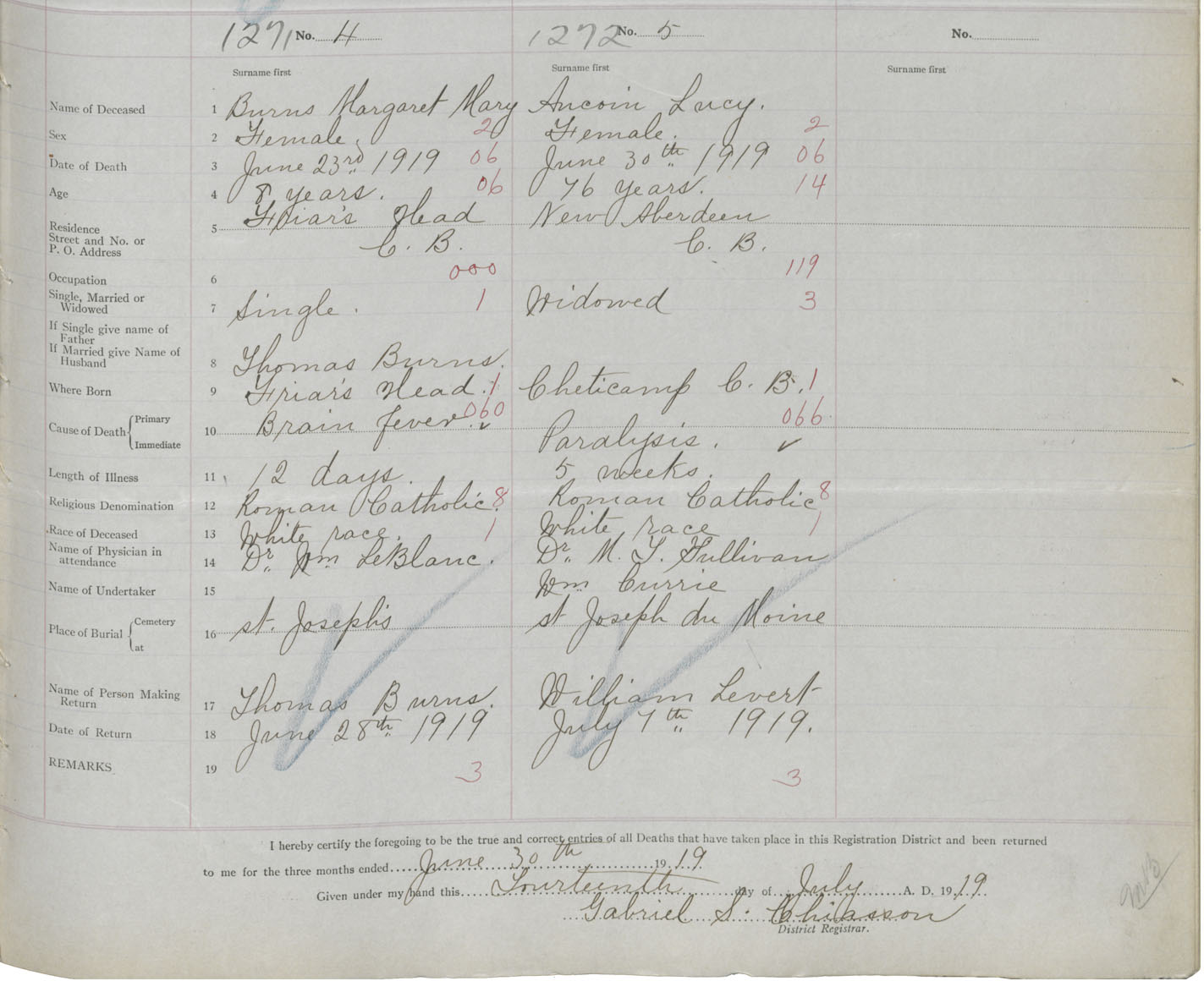 Death Registration: Year: 1919 book: 43 page: 423 number: 1272