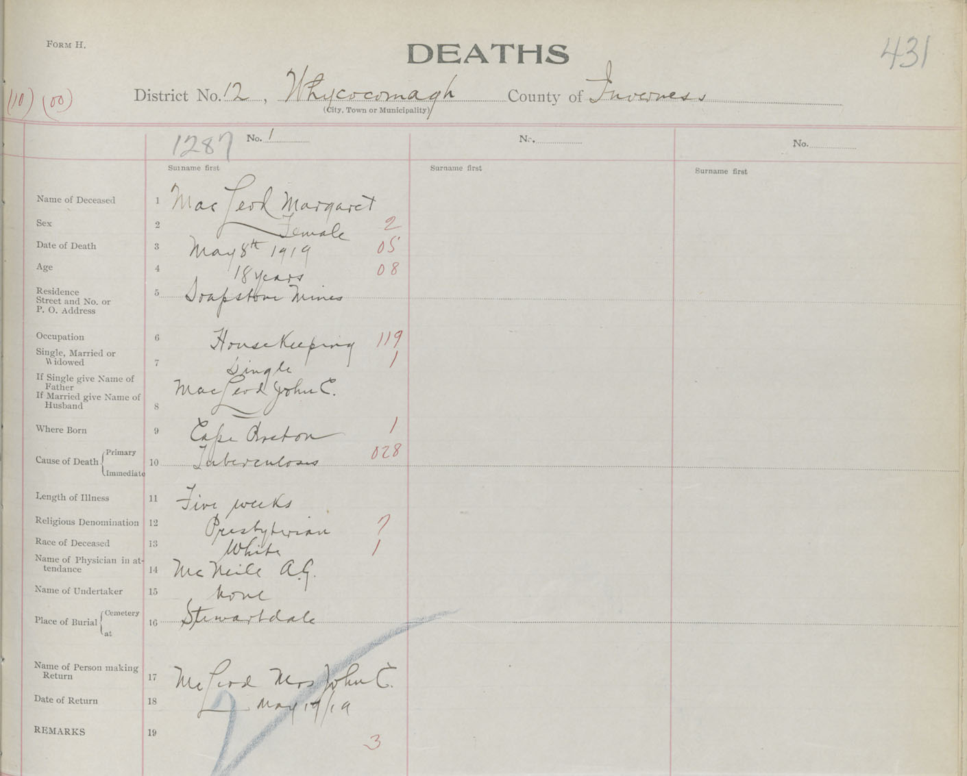 Death Registration: Year: 1919 book: 43 page: 431 number: 1287