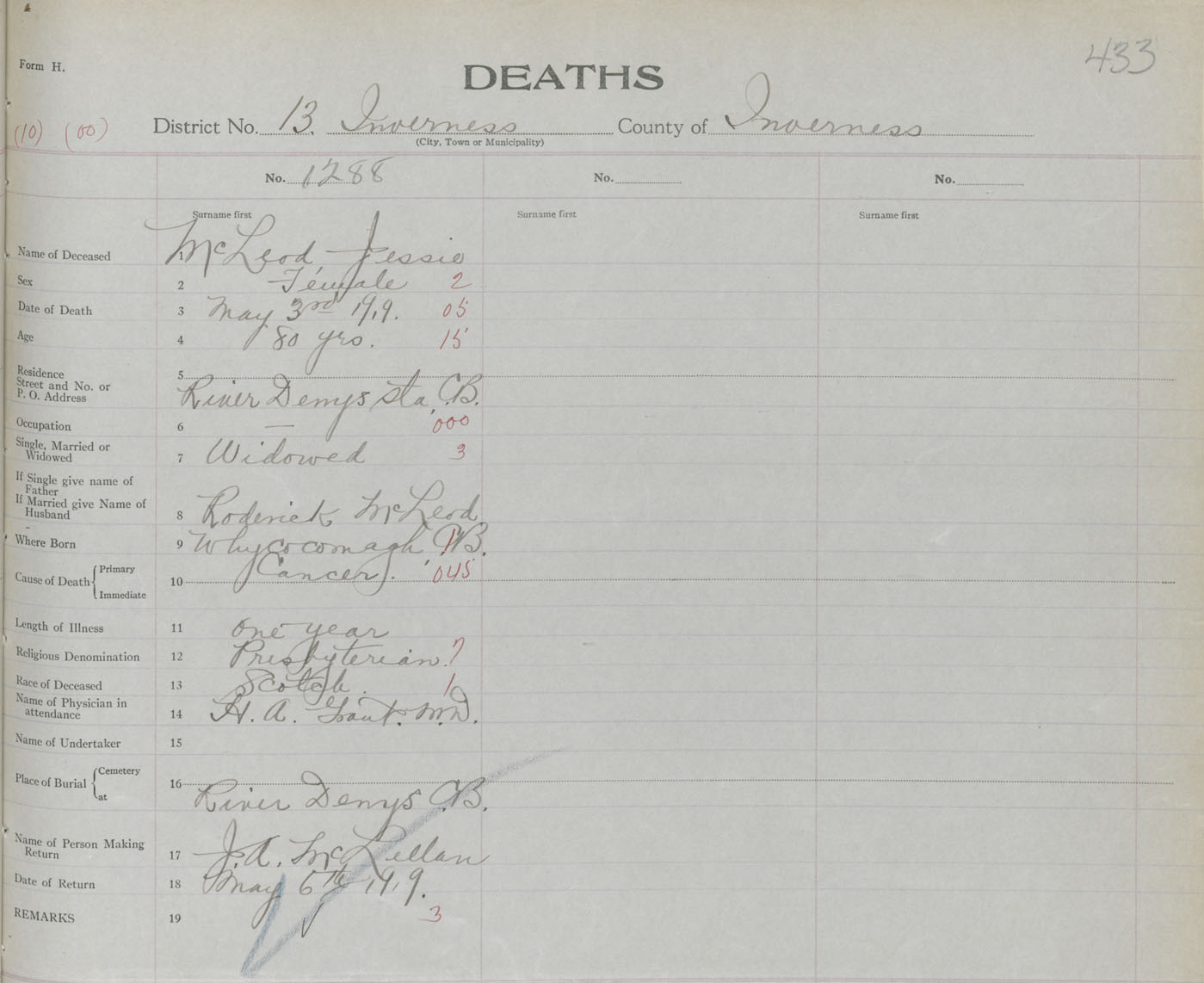Death Registration: Year: 1919 book: 43 page: 433 number: 1288