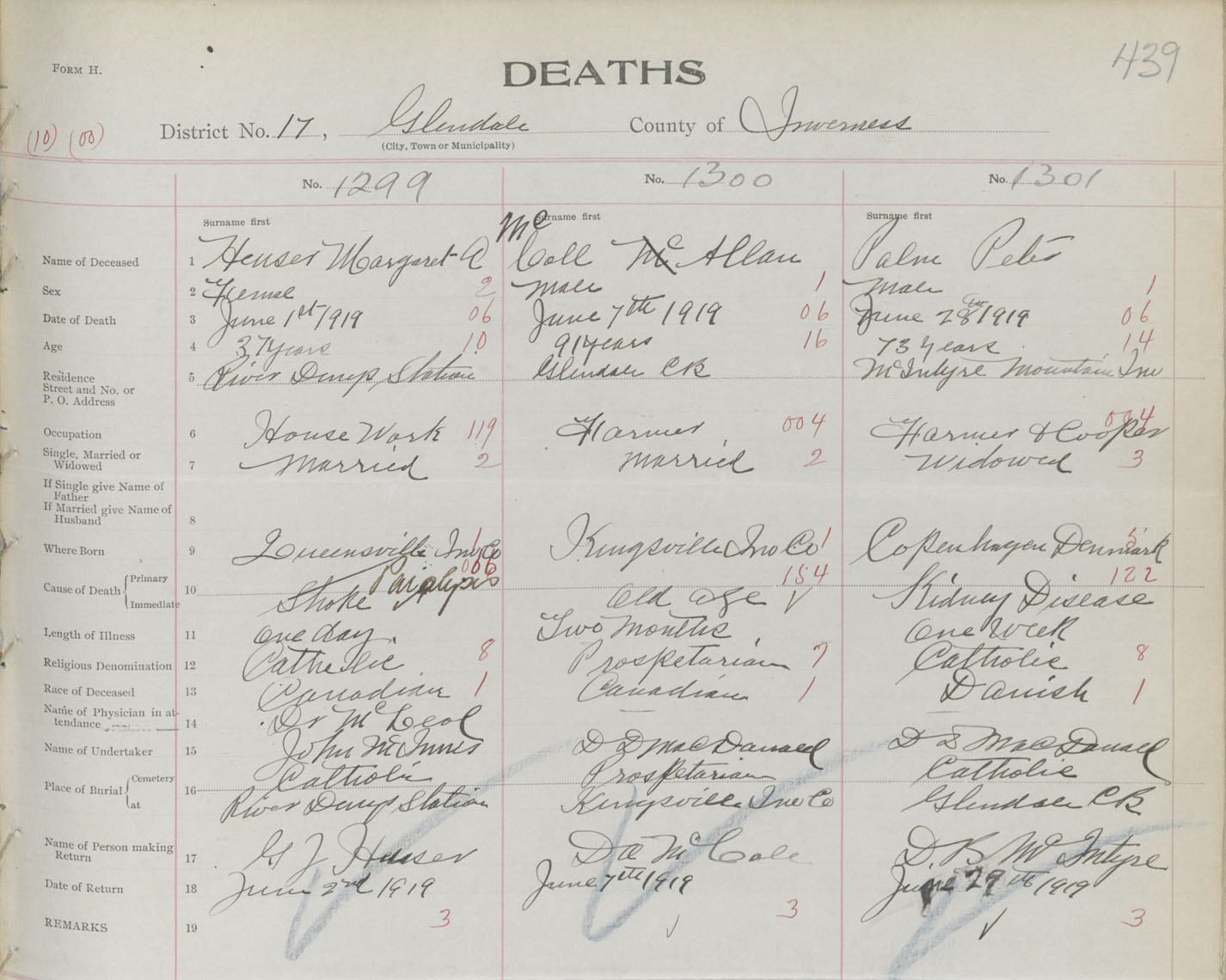 Death Registration: Year: 1919 book: 43 page: 439 number: 1301