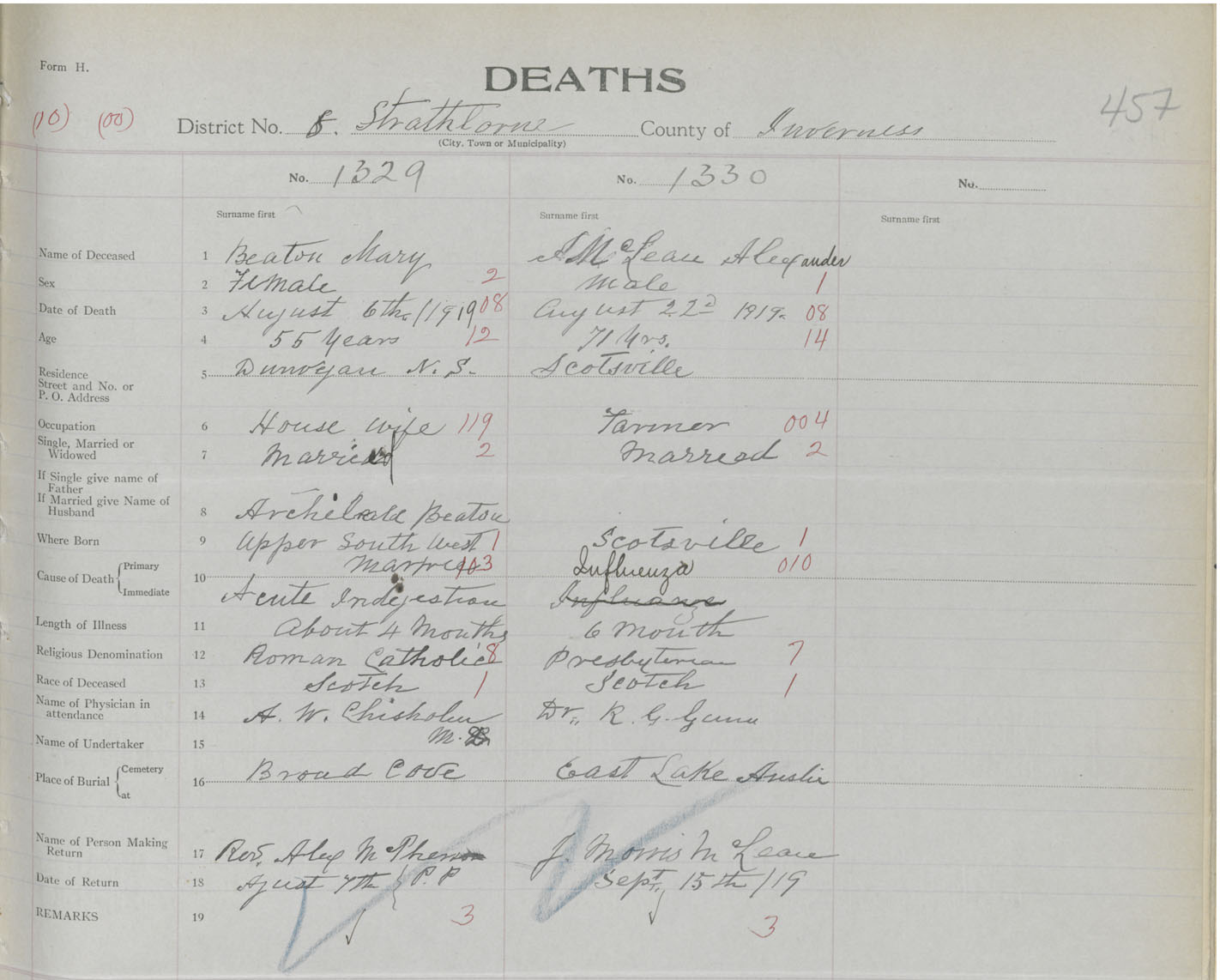 Death Registration: Year: 1919 book: 43 page: 457 number: 1330