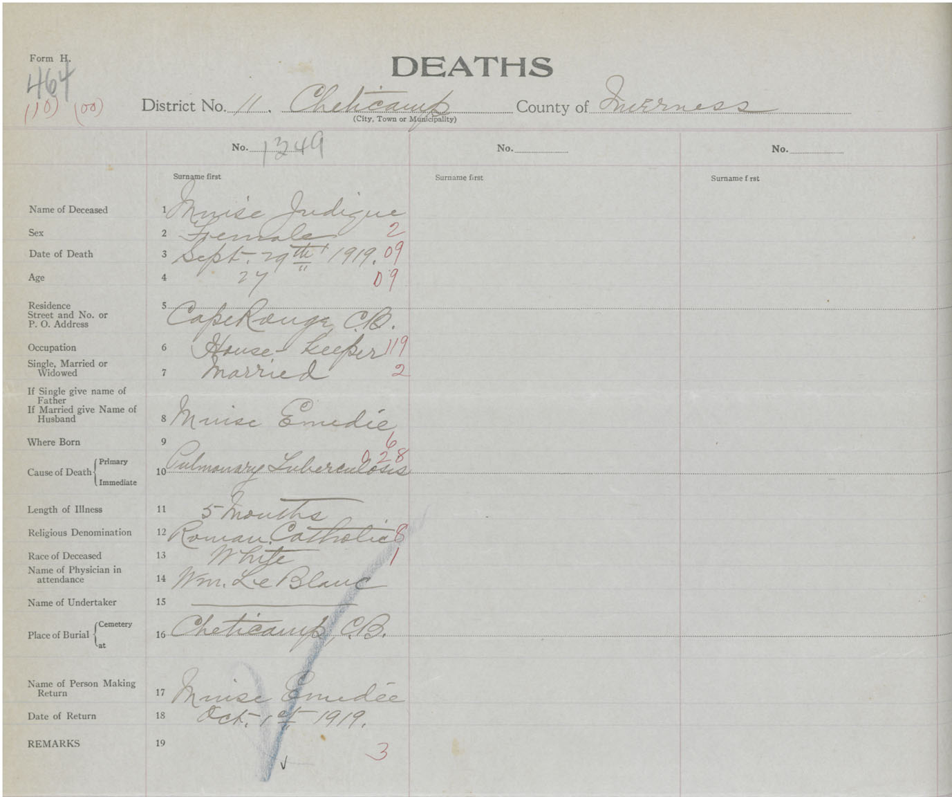 Death Registration: Year: 1919 book: 43 page: 464 number: 1349