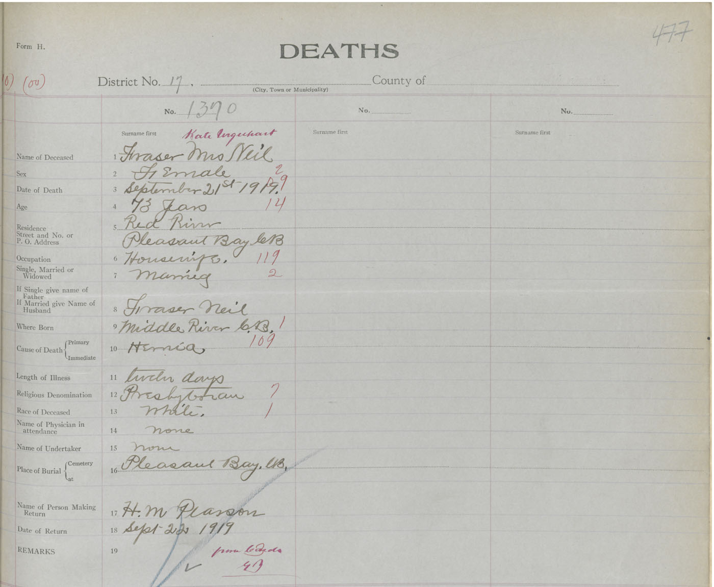 Death Registration: Year: 1919 book: 43 page: 477 number: 1370