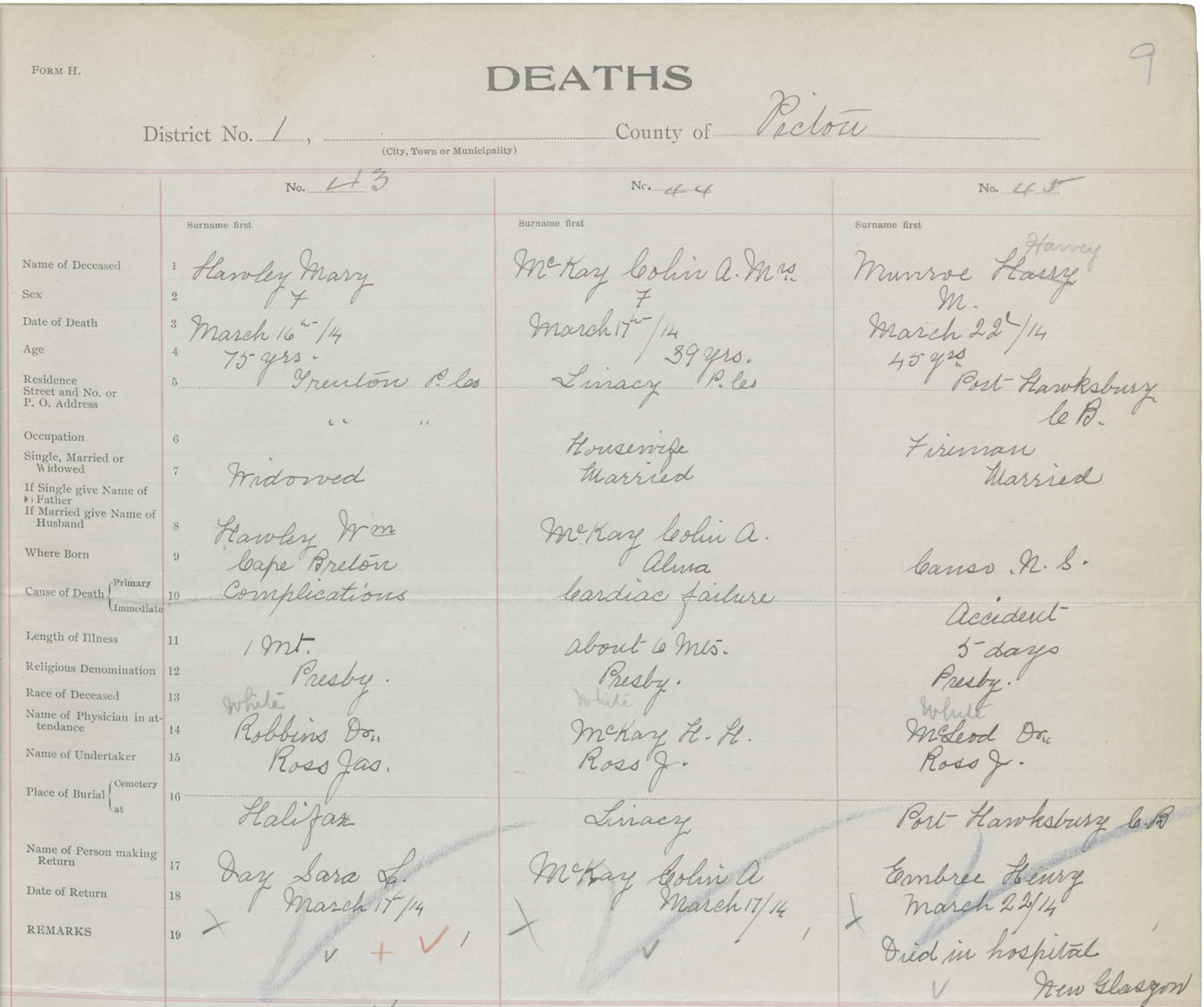 Death Registration: Year: 1914 book: 44 page: 9 number: 43