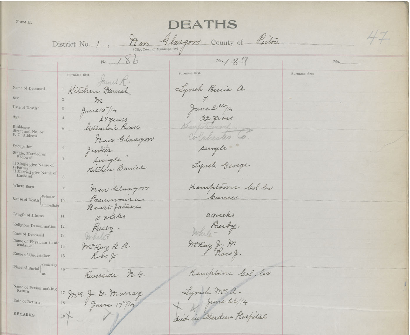 Death Registration: Year: 1914 book: 44 page: 47 number: 186