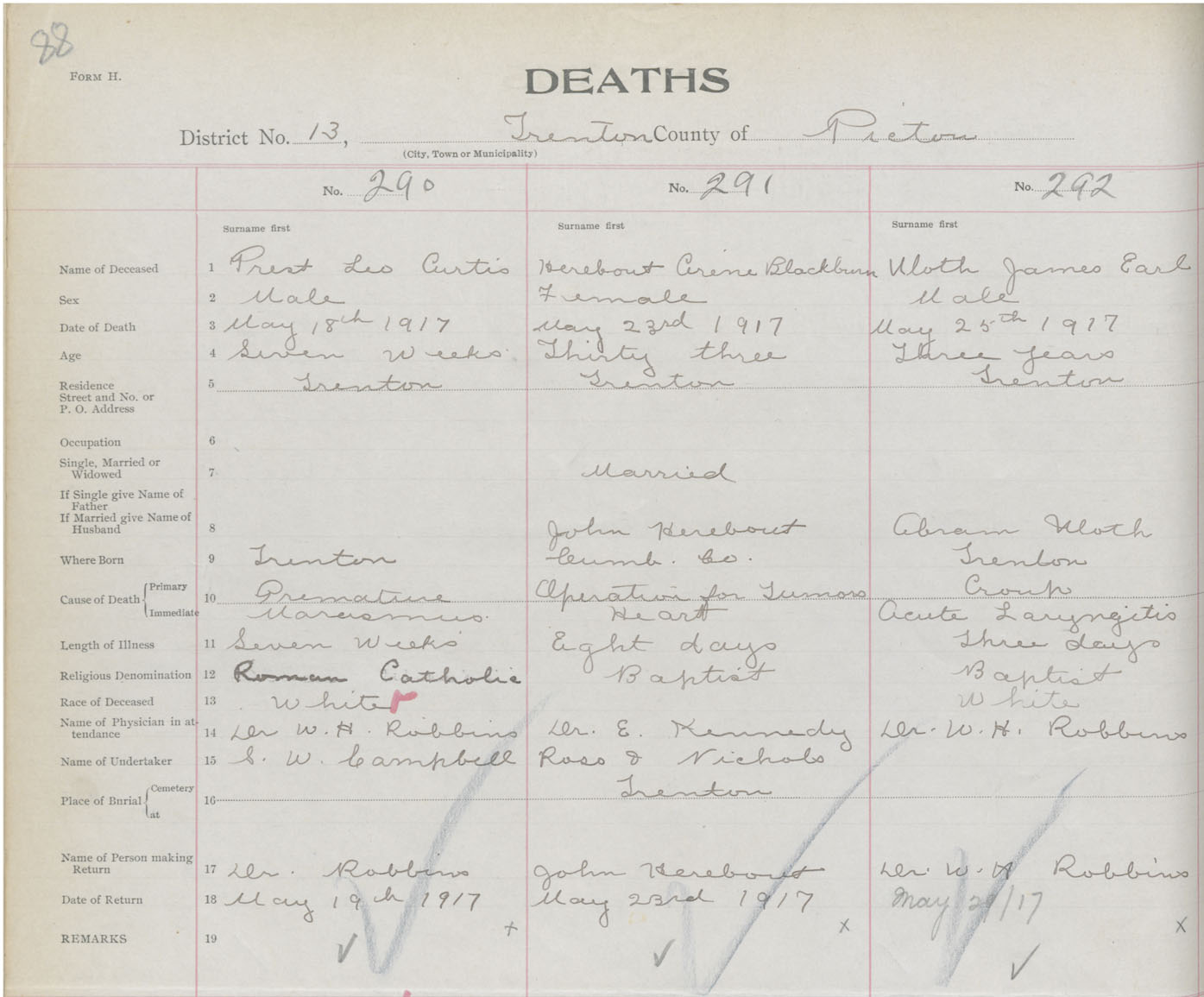 Death Registration: Year: 1917 book: 45 page: 88 number: 292