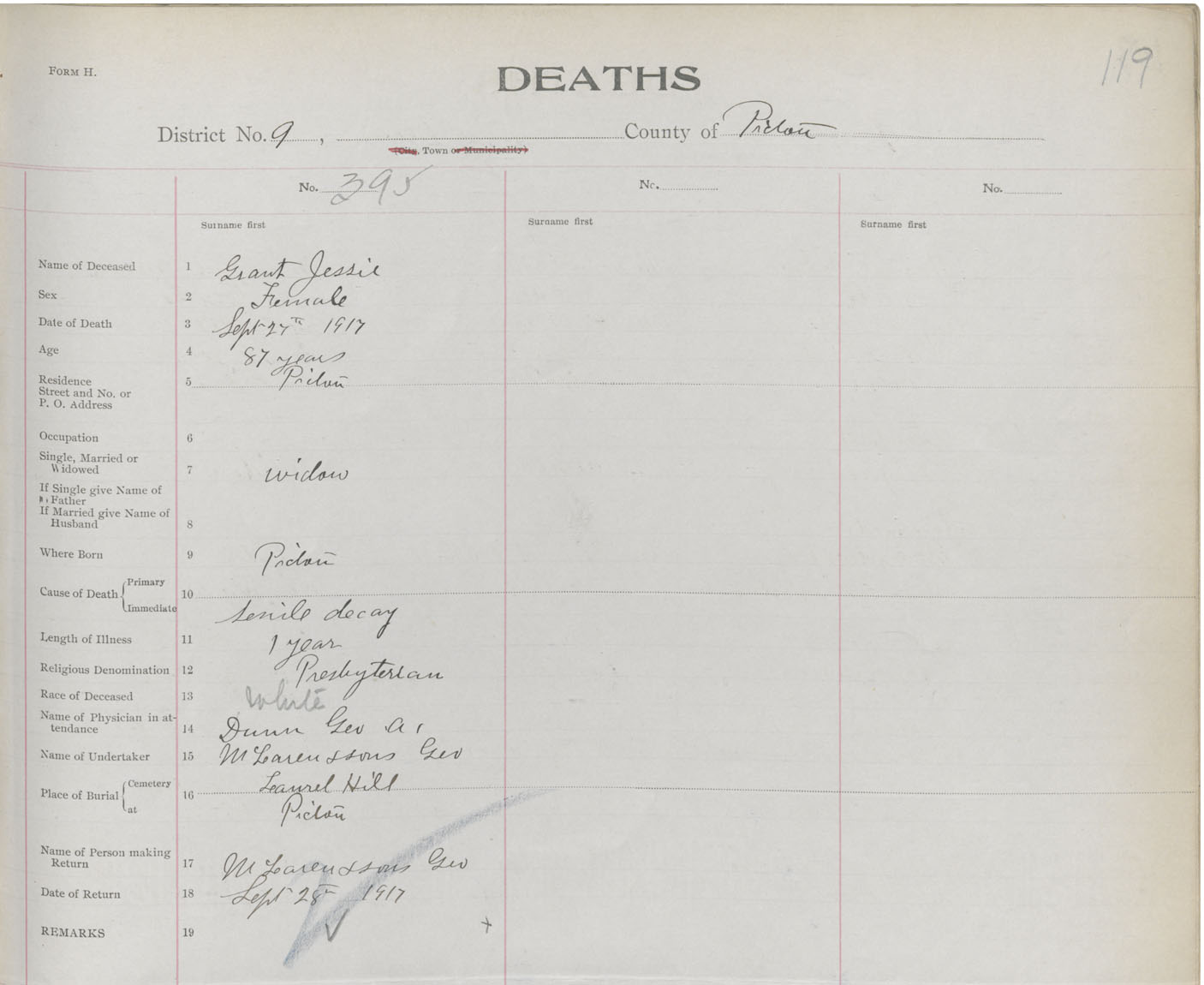 Death Registration: Year: 1917 book: 45 page: 119 number: 395