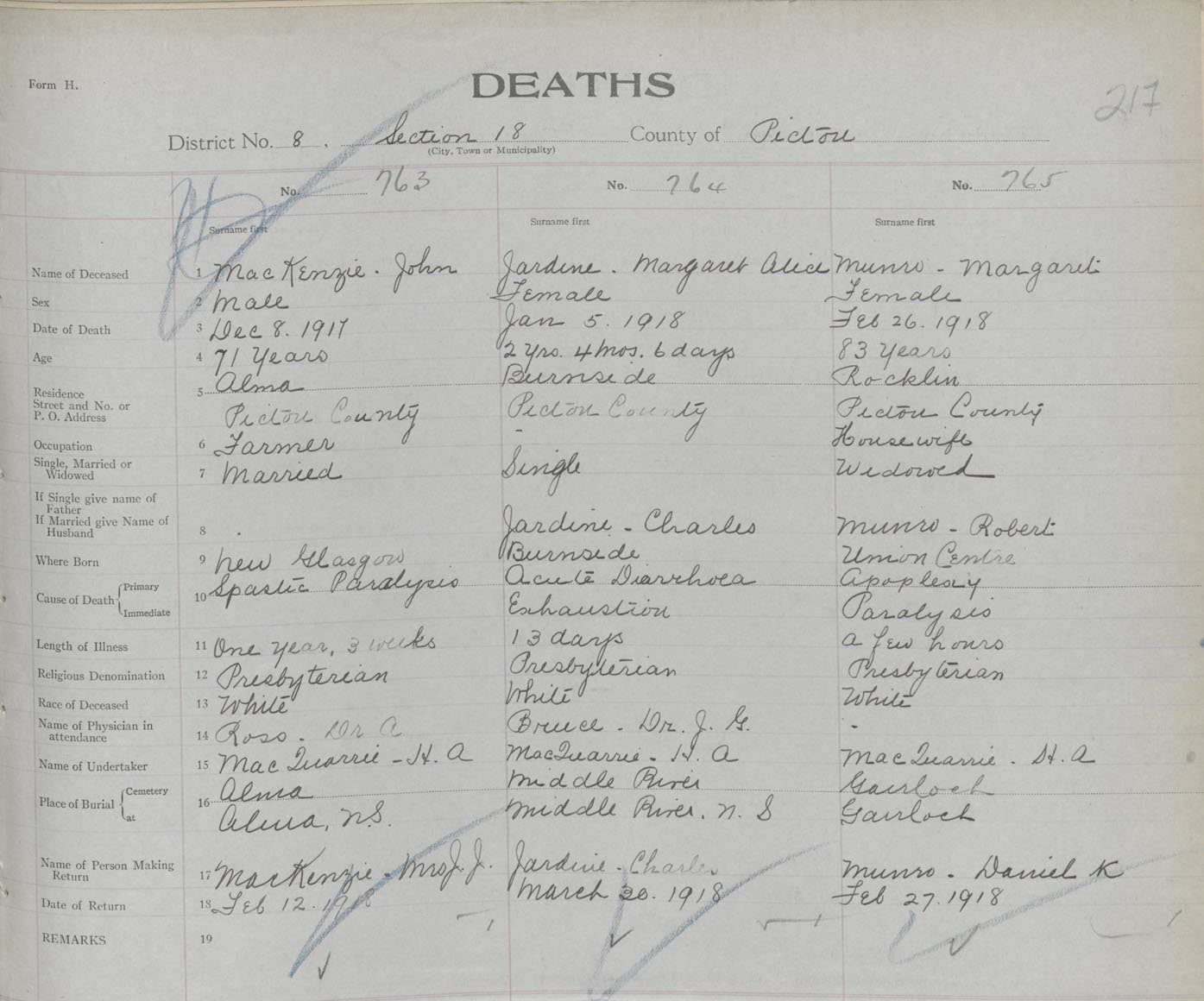 Death Registration: Year: 1917 book: 45 page: 217 number: 763