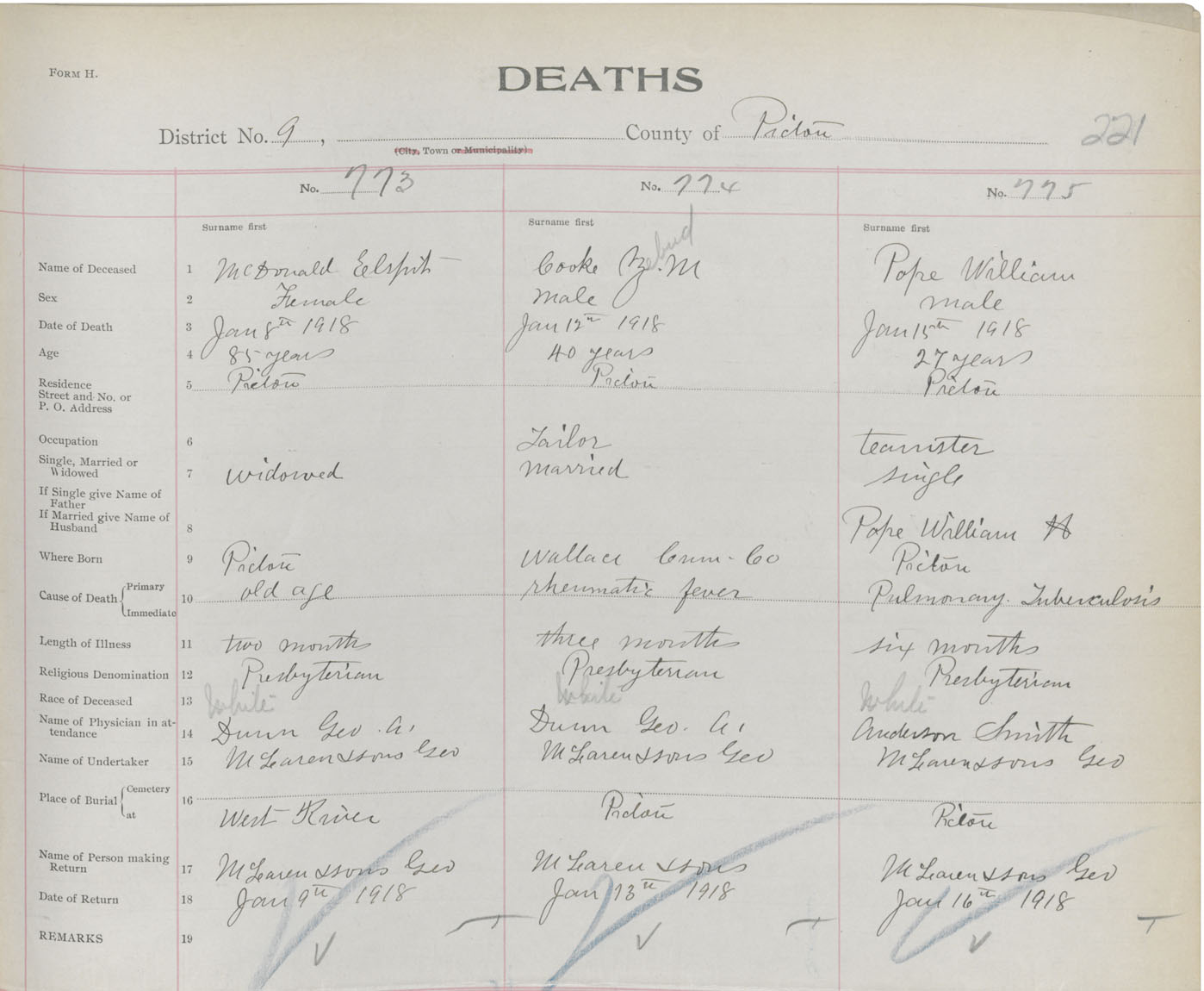 Death Registration: Year: 1918 book: 45 page: 221 number: 773