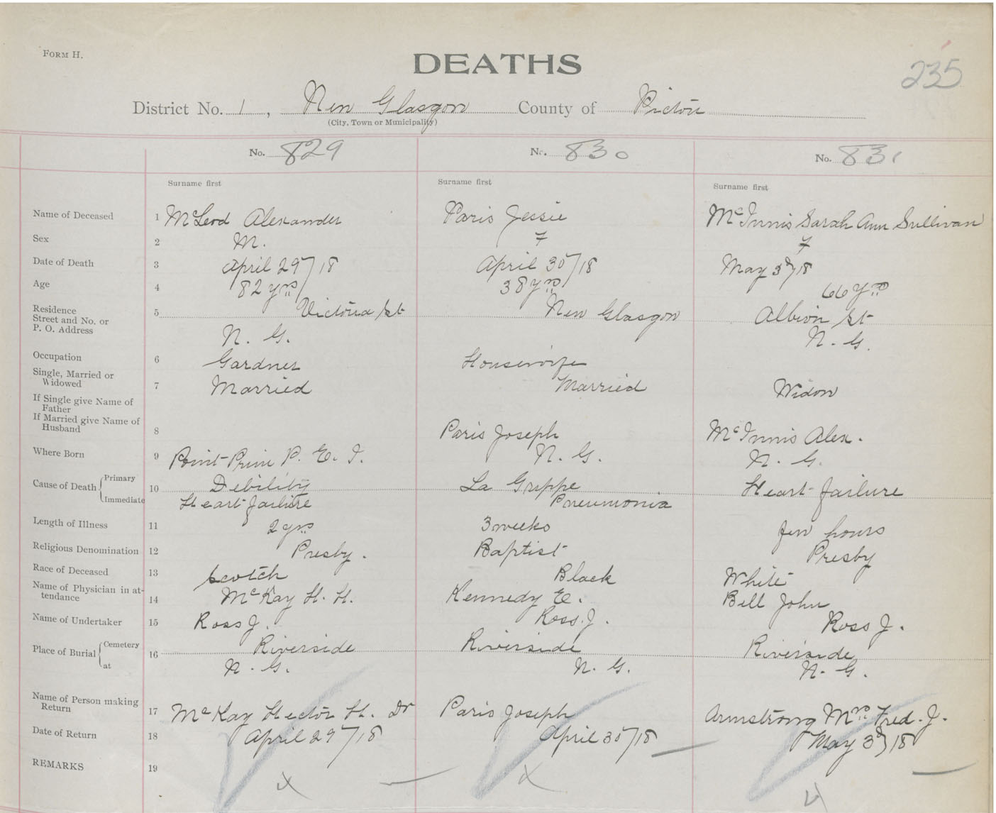 Death Registration: Year: 1918 book: 45 page: 235 number: 831