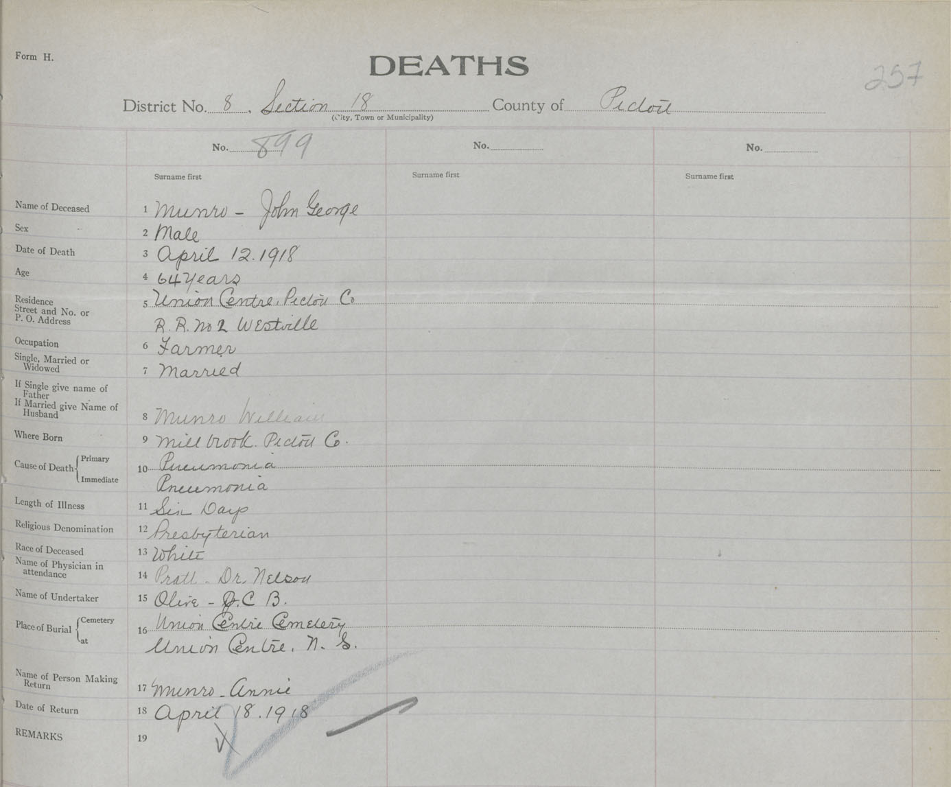 Death Registration: Year: 1918 book: 45 page: 257 number: 899