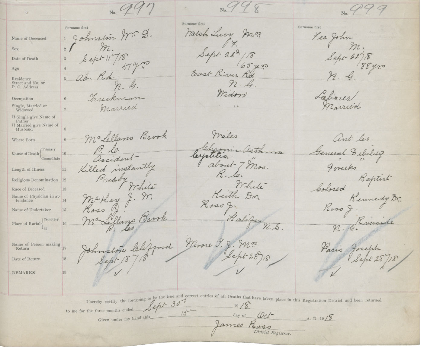 Death Registration: Year: 1918 book: 45 page: 281 number: 999
