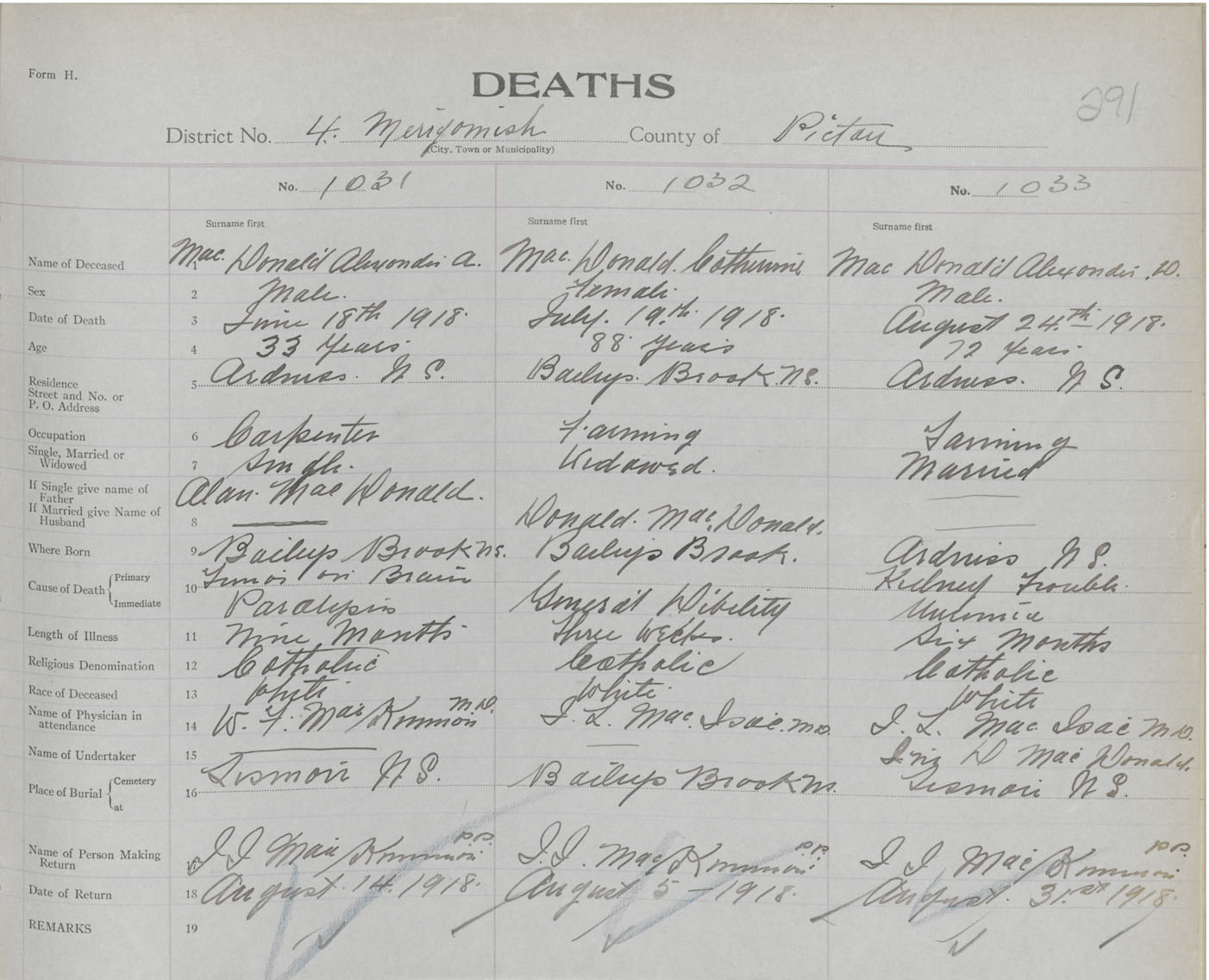 Death Registration: Year: 1918 book: 45 page: 291 number: 1033
