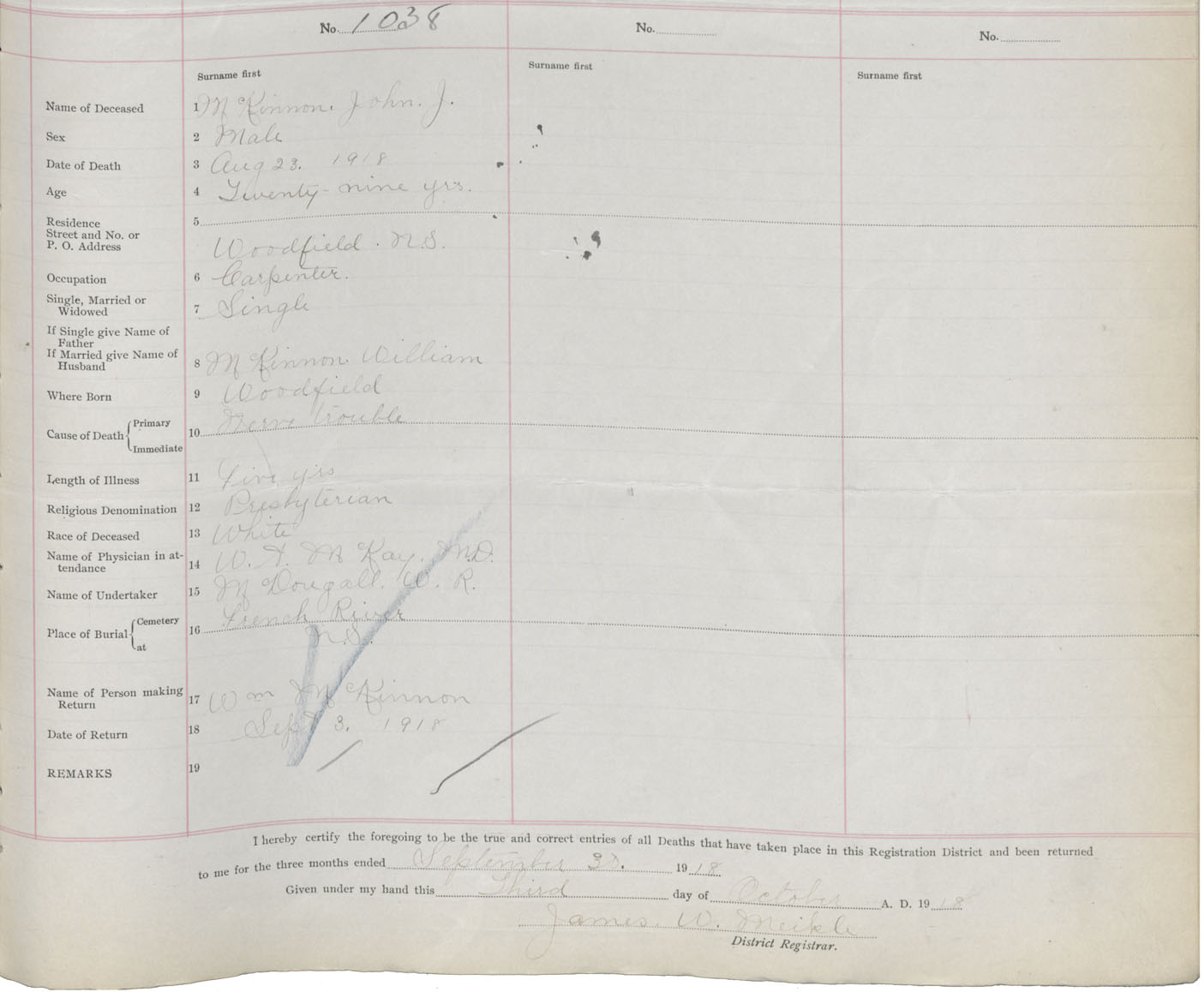 Death Registration: Year: 1918 book: 45 page: 293 number: 1038