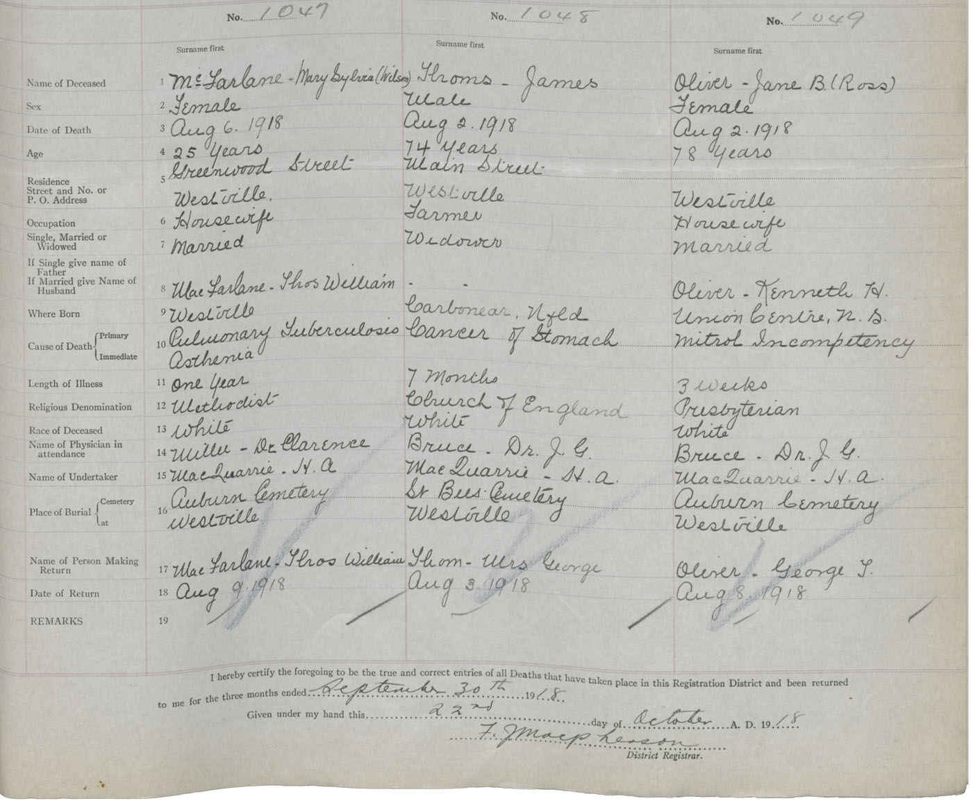 Death Registration: Year: 1918 book: 45 page: 299 number: 1047