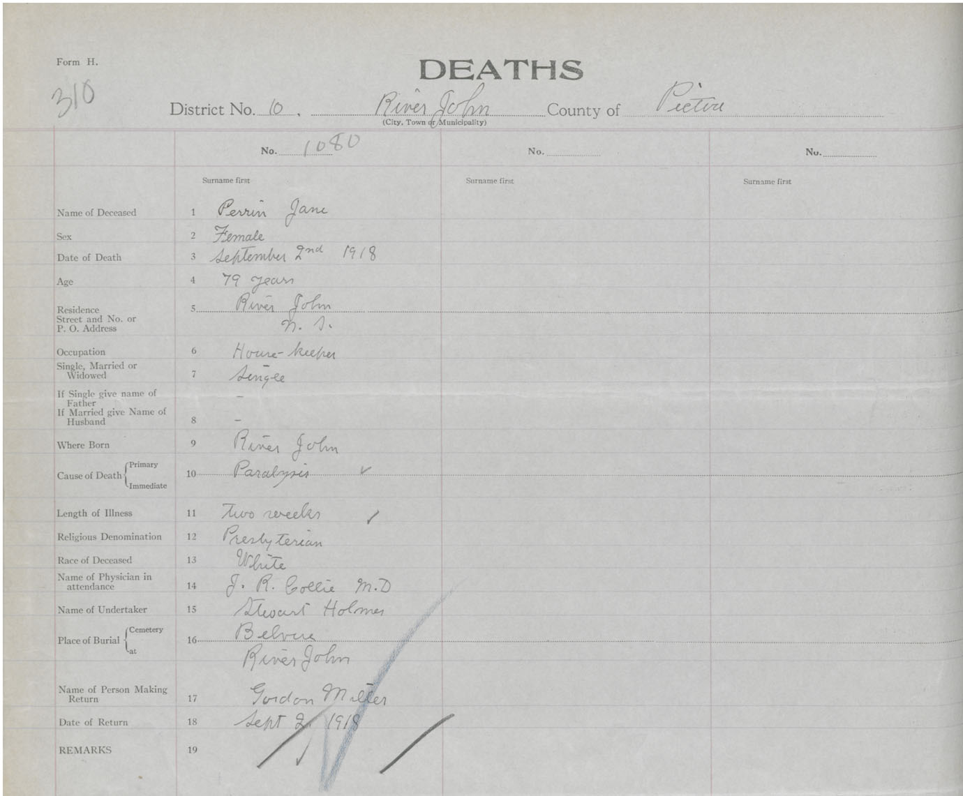 Death Registration: Year: 1918 book: 45 page: 310 number: 1080