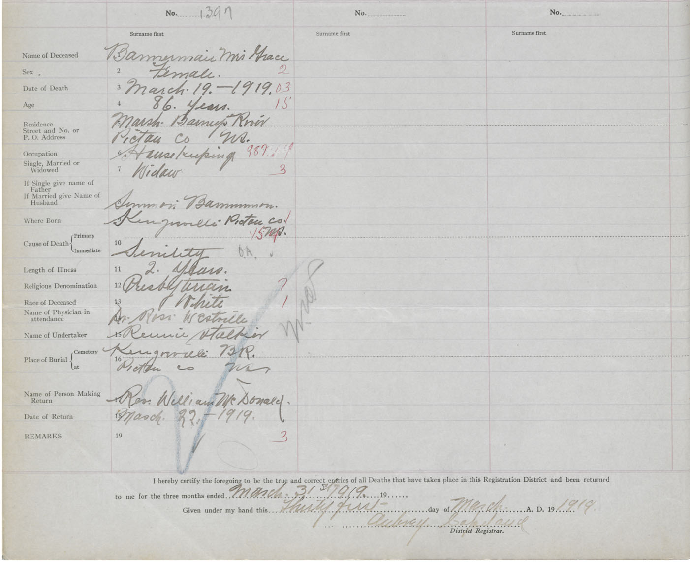 Death Registration: Year: 1919 book: 45 page: 388 number: 1397
