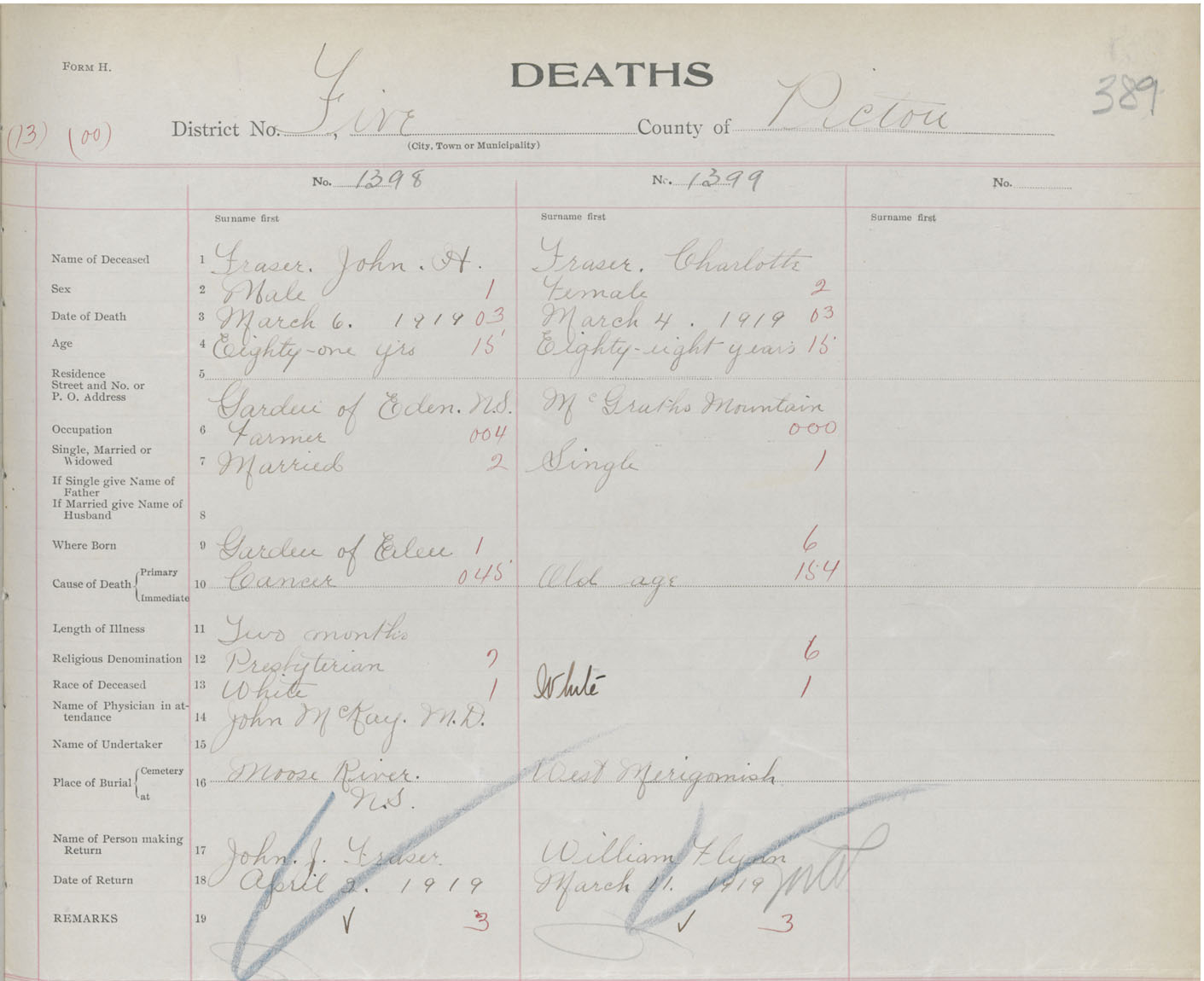 Death Registration: Year: 1919 book: 45 page: 389 number: 1399