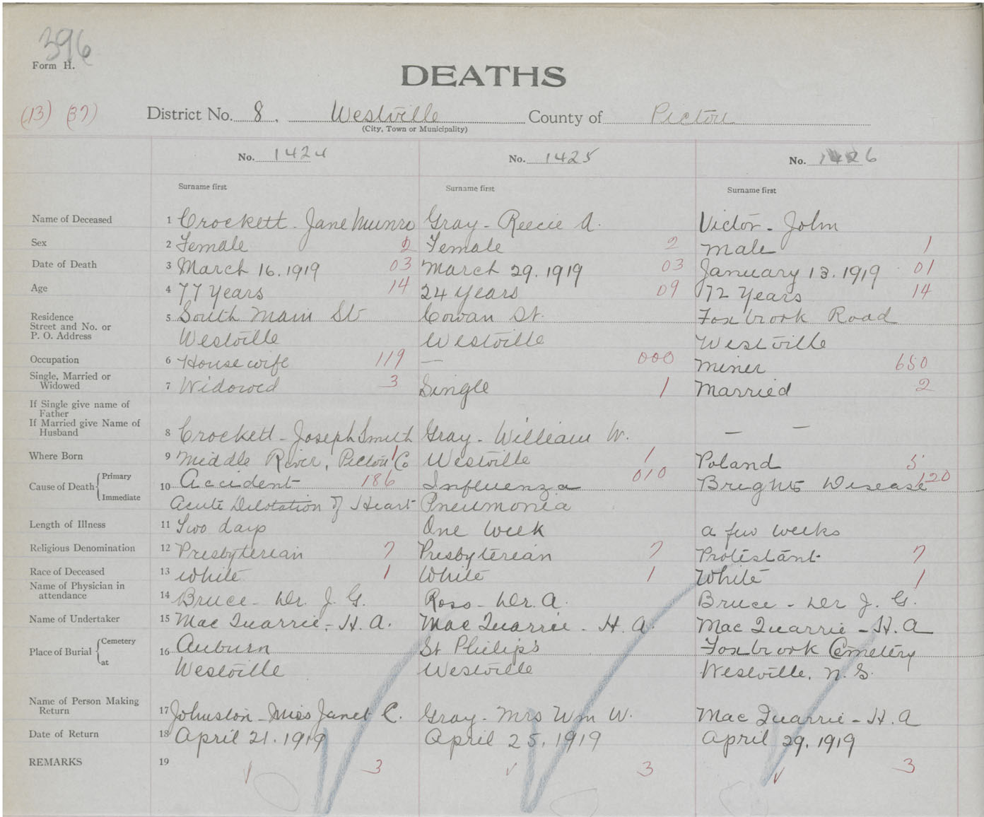 Death Registration: Year: 1919 book: 45 page: 396 number: 1424