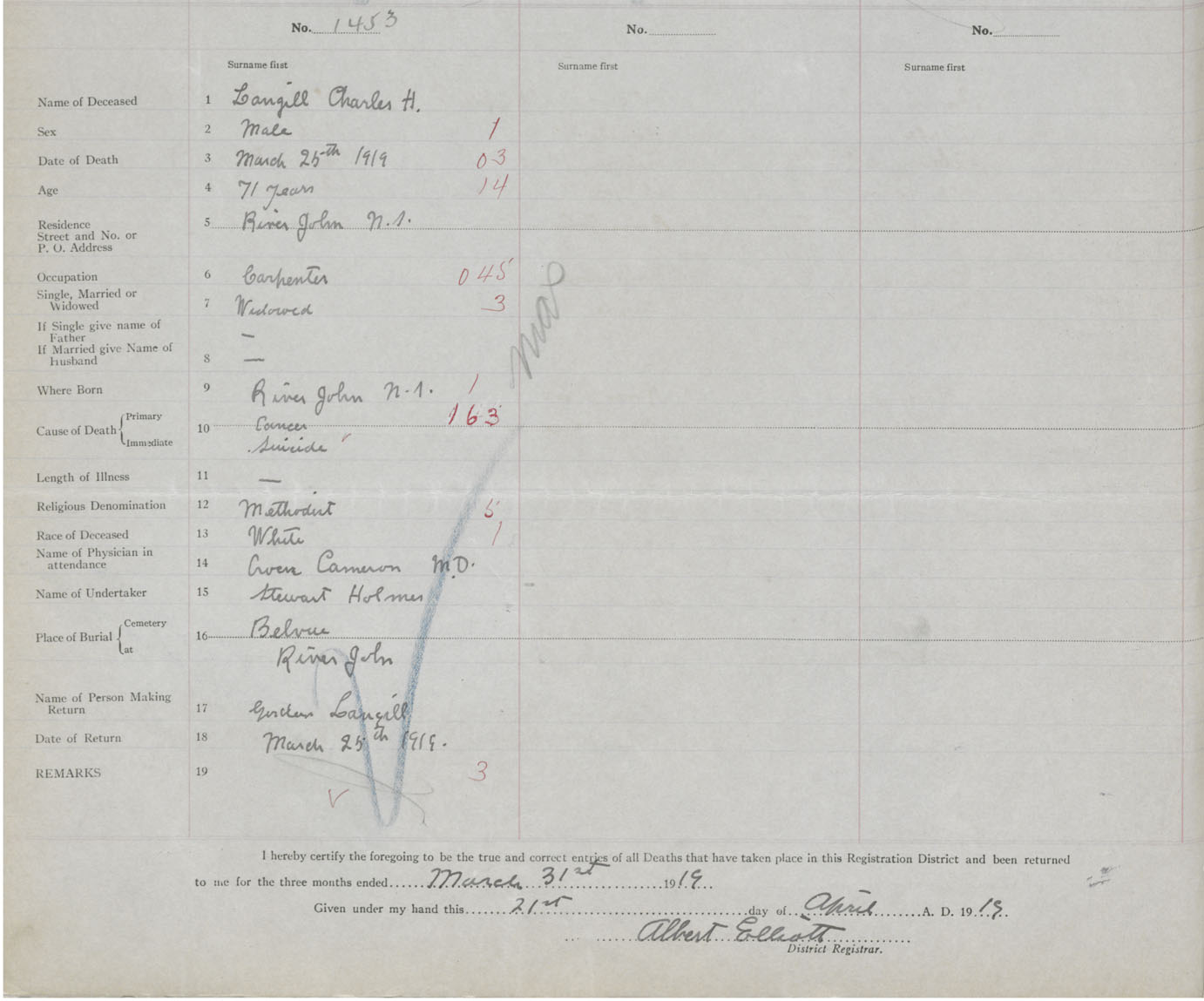 Death Registration: Year: 1919 book: 45 page: 404 number: 1453