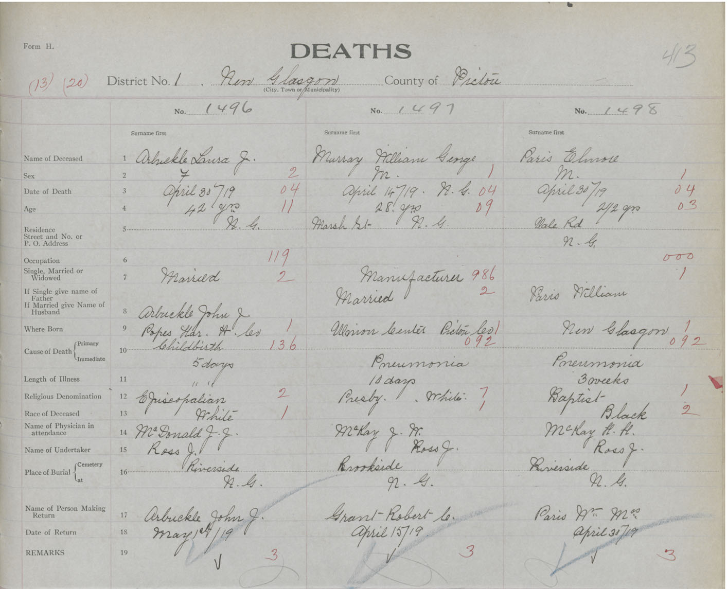 Death Registration: Year: 1919 book: 45 page: 413 number: 1496