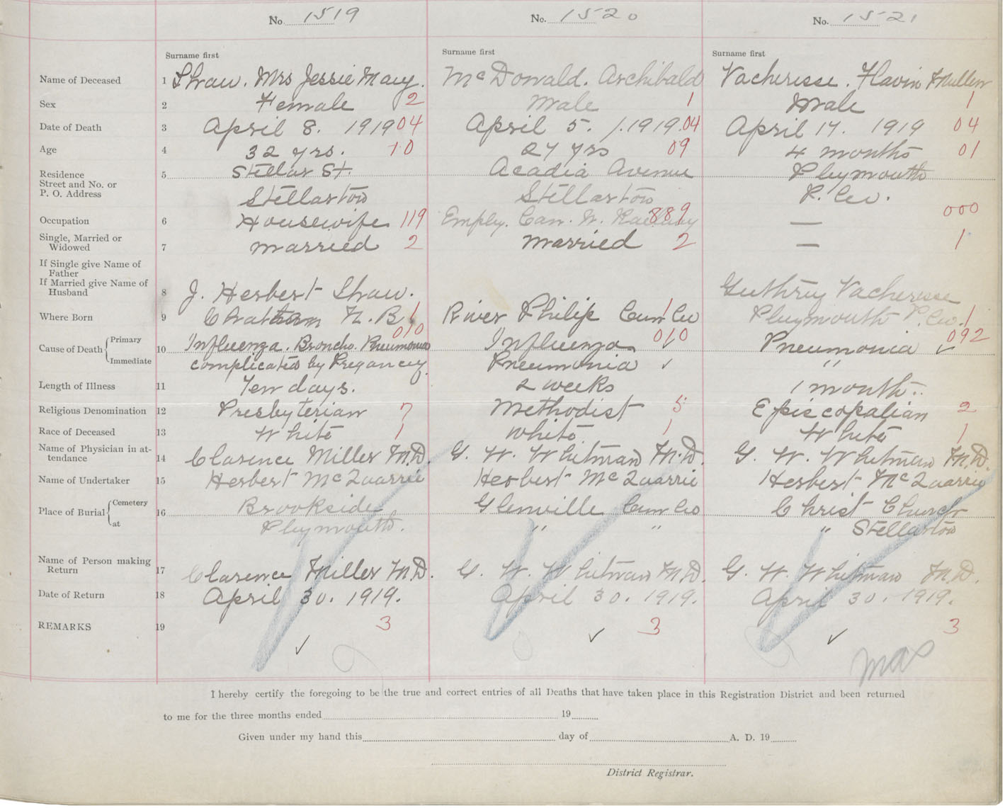 Death Registration: Year: 1919 book: 45 page: 419 number: 1519