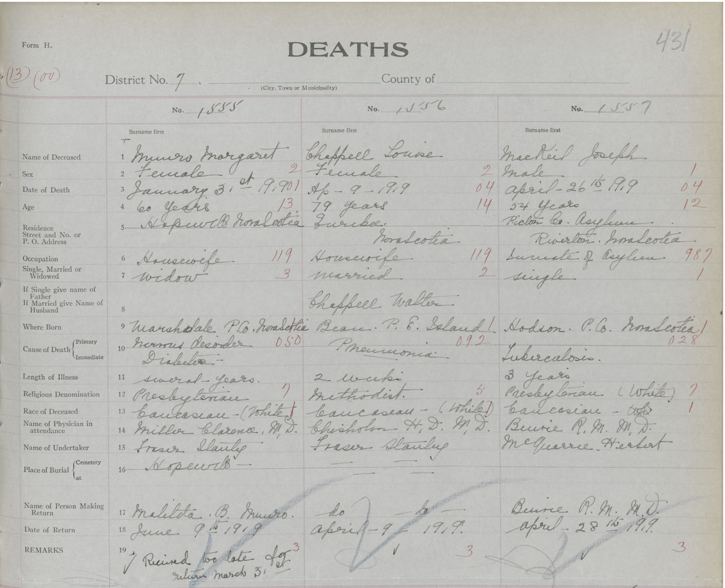 Death Registration: Year: 1919 book: 45 page: 431 number: 1555