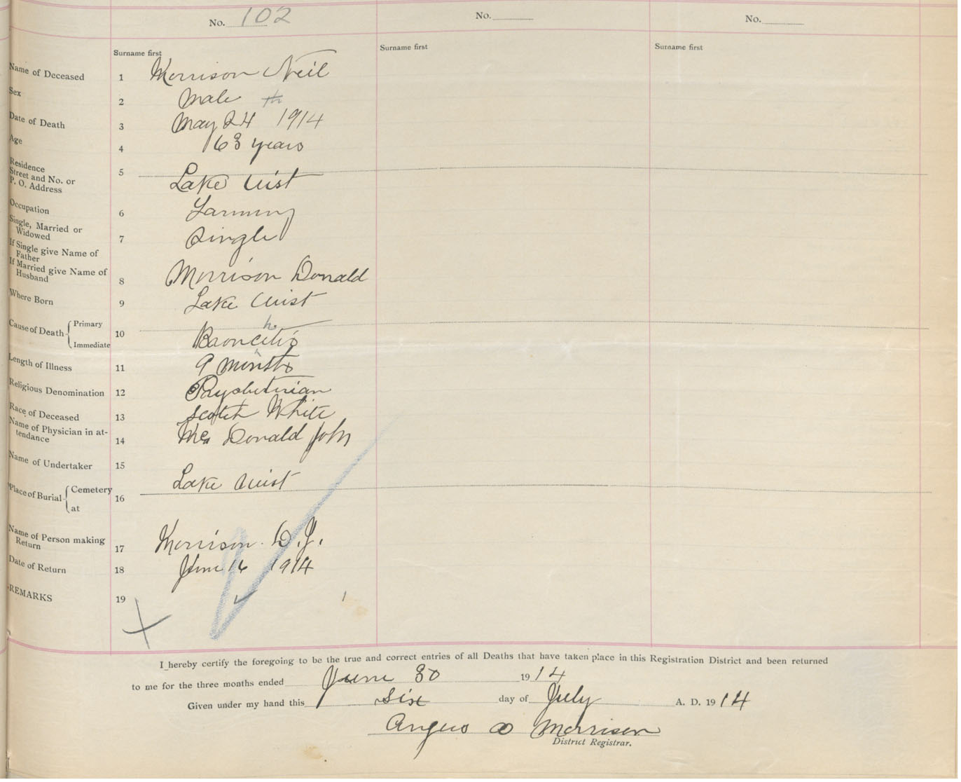 Male Death Registration: Year: 1914 book: 47 page: 47 number: 102