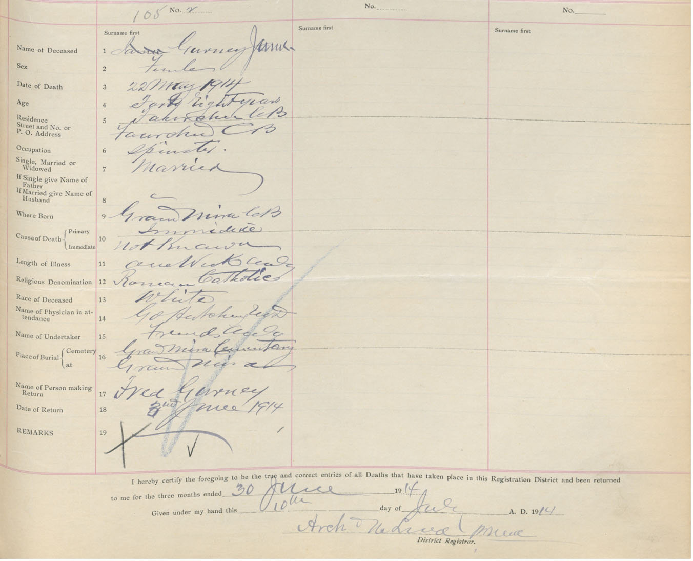 Female Death Registration: Year: 1914 book: 47 page: 49 number: 105