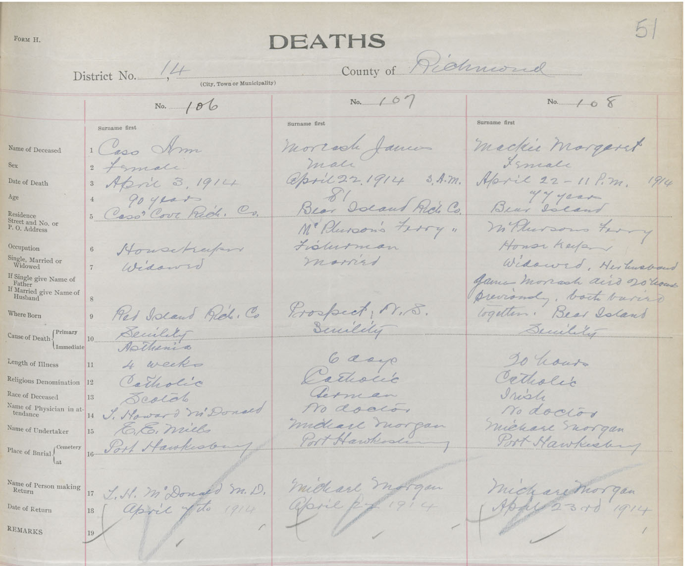 Female Death Registration: Year: 1914 book: 47 page: 51 number: 108