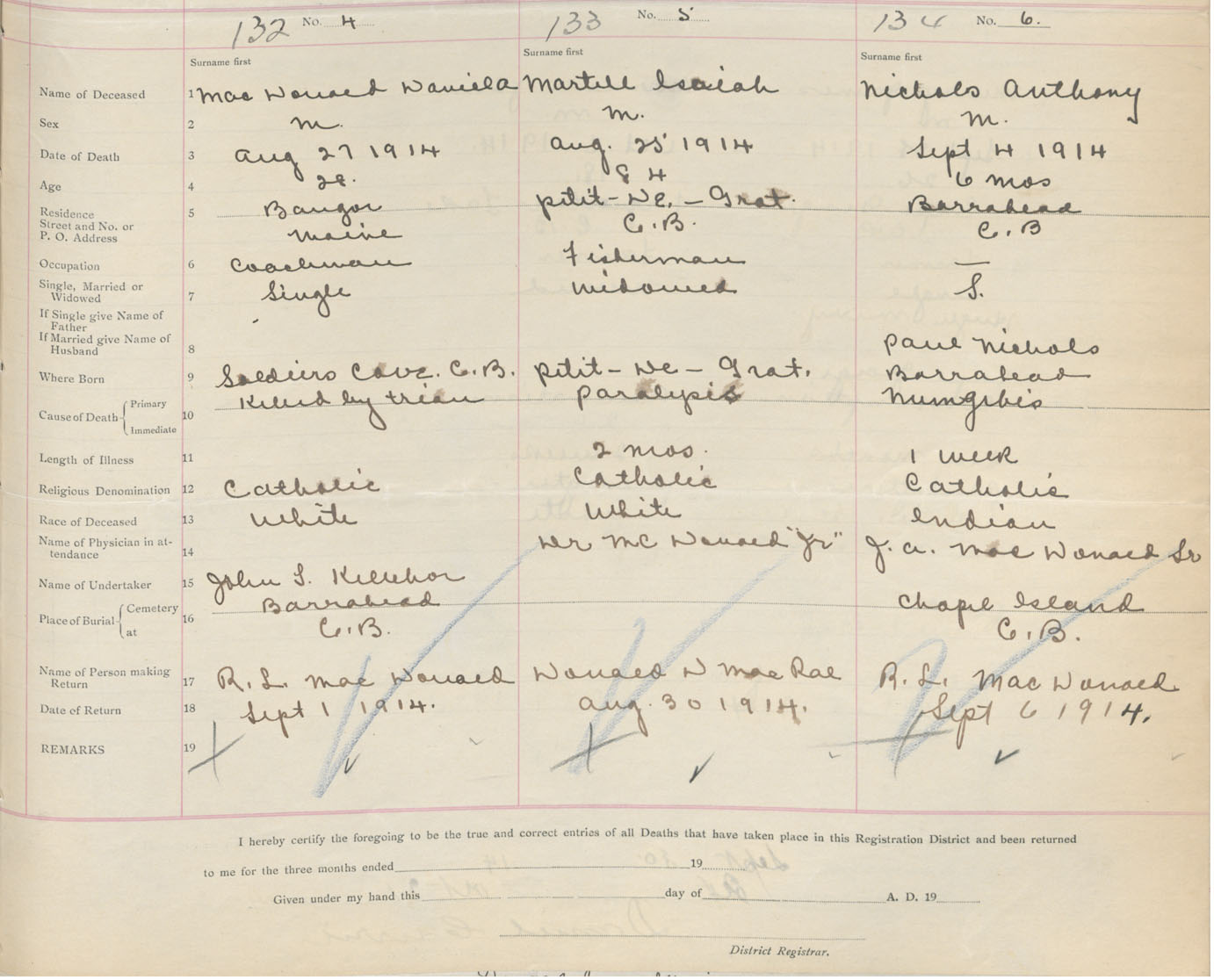Male Death Registration: Year: 1914 book: 47 page: 61 number: 132
