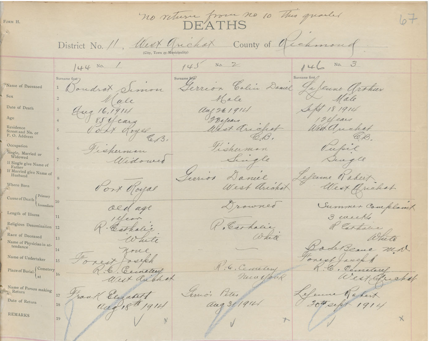 Male Death Registration: Year: 1914 book: 47 page: 67 number: 144
