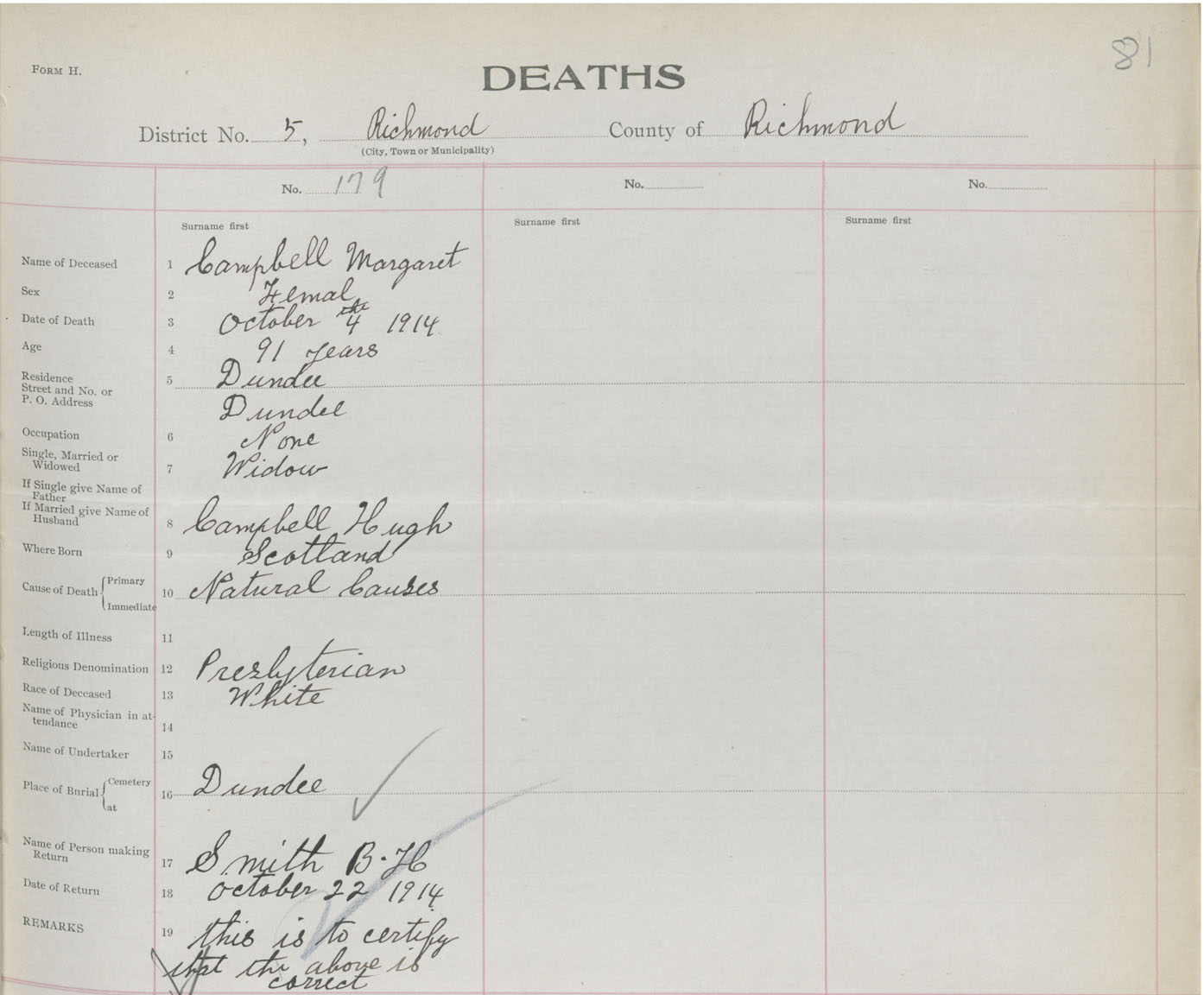 Female Death Registration: Year: 1914 book: 47 page: 81 number: 179